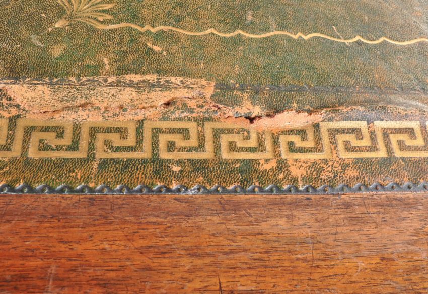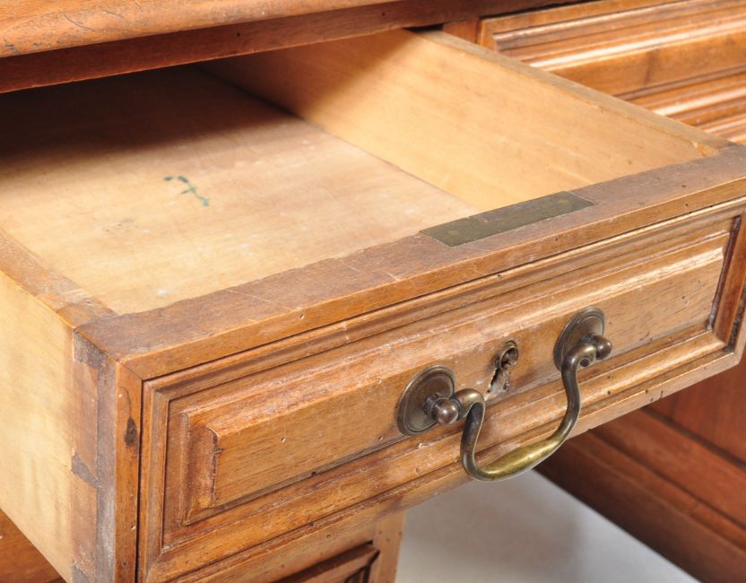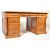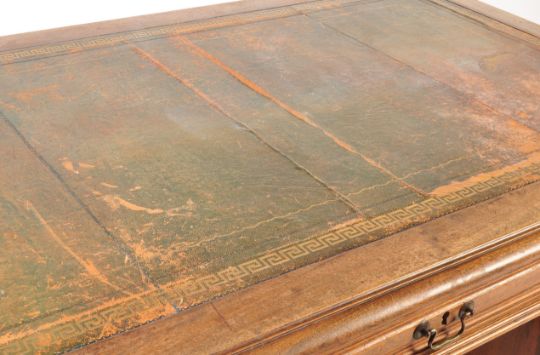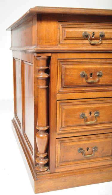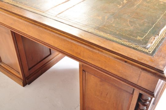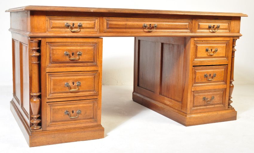 A 19th century Victorian era French walnut twin pedestal desk. The desk comprising of a desk top with green leather skiver with gilt Greek key border and twin drawers beneath each with brass swan neck handles. Raised upon two supports with turned baluster column set within over a stepped plinth base to each. Measures approx: 77cm x 149cm x 90cm