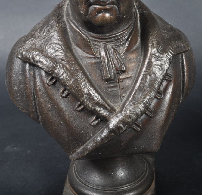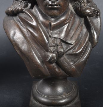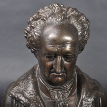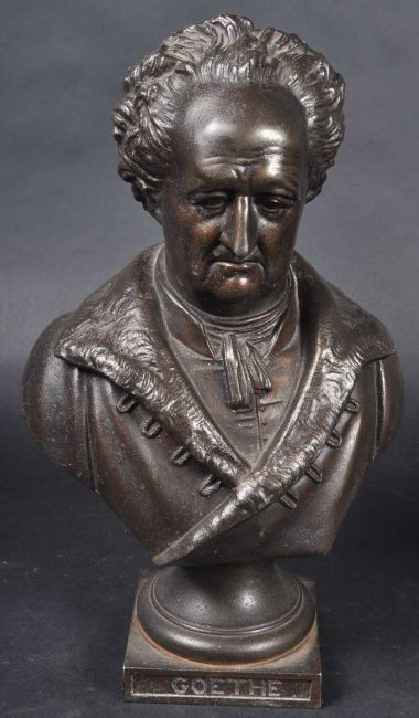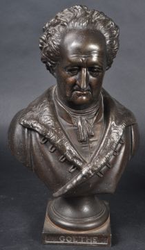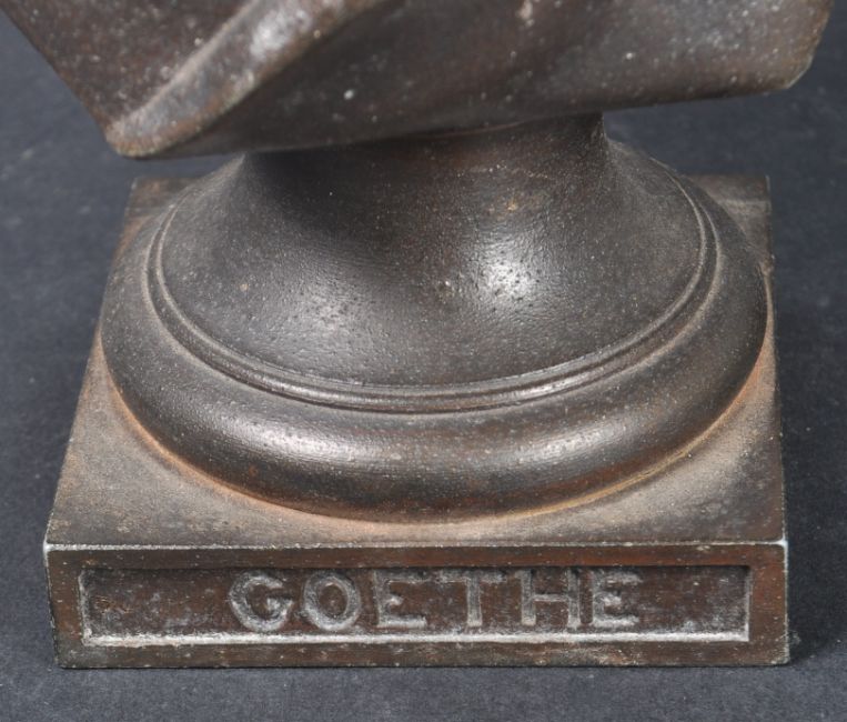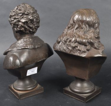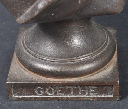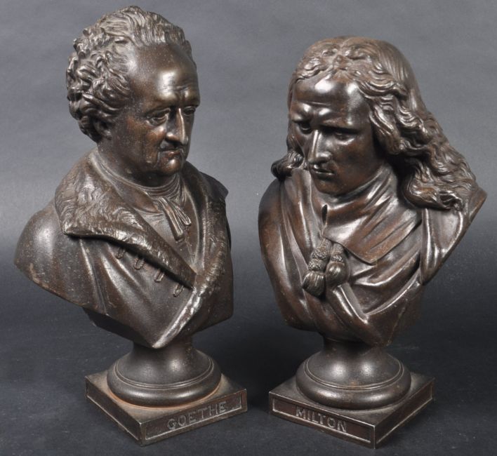 A pair of 19th Century Victorian bronze effect spelter busts each highly detailed. One depicting Milton and the other Goethe with each raised on square plinth base with names etched in. No signs of damage. Measures approx; 29cm x 18cm x 10cm.