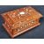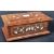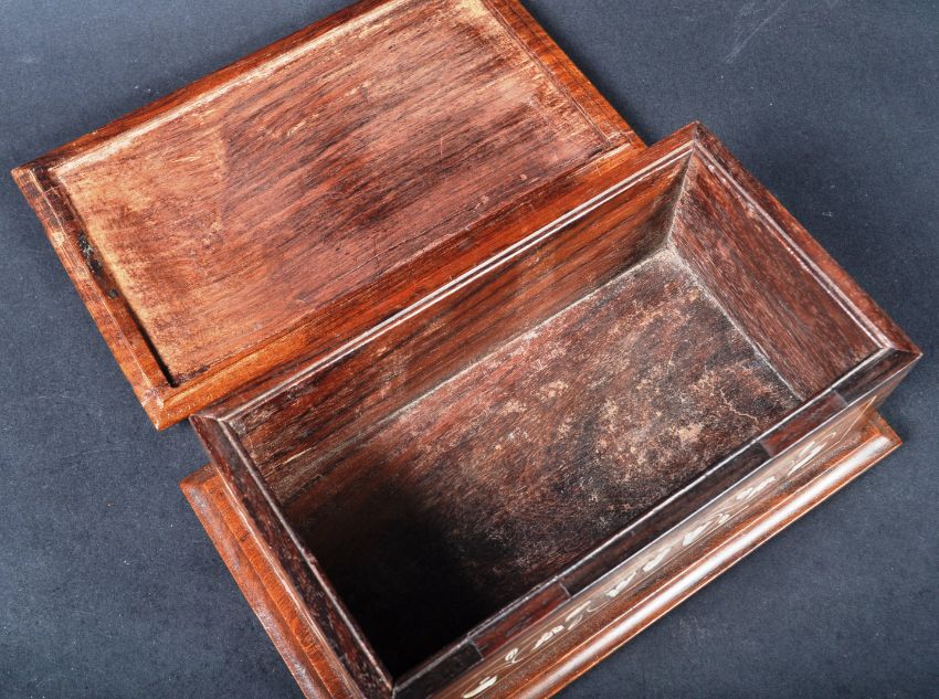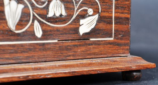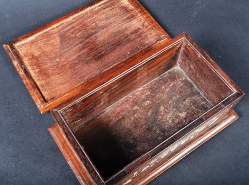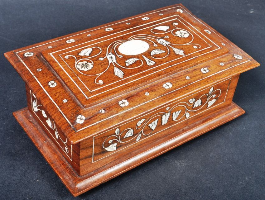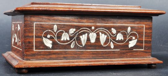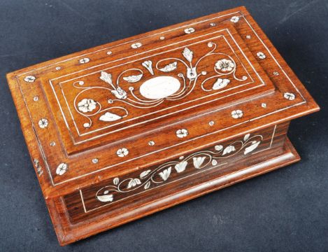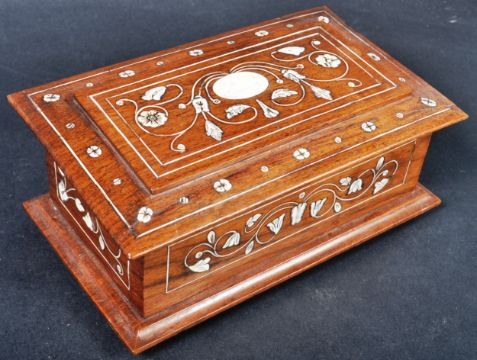 A 16th Century manner Indian rosewood inlaid jewellery casket trinket box of sarcophagus form. The box having inlaid bone decoration depicting floral motifs and line inlaid borders. Measures approx; 7cm x 20cm.