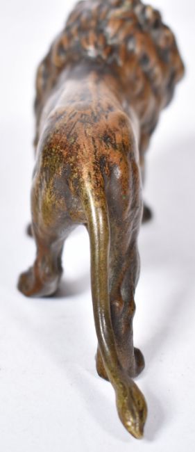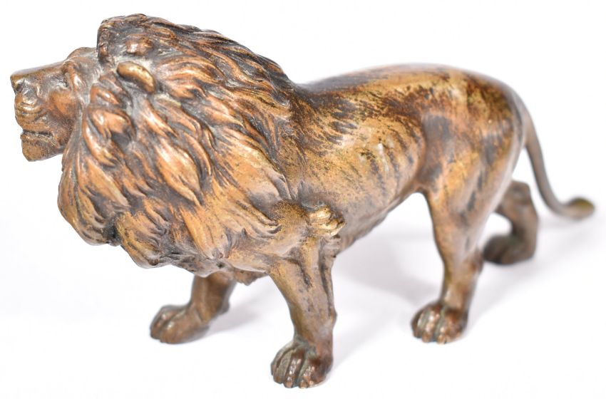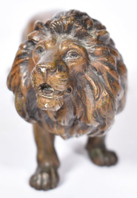 A 19th Century Austrian cold painted bronze figurine in the form of a lion. The proud lion figure having detailed painted patina finish and features raised on four paws. Measures approx; 15cm long.