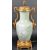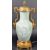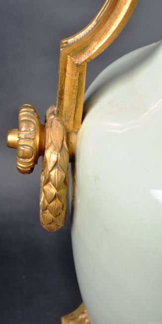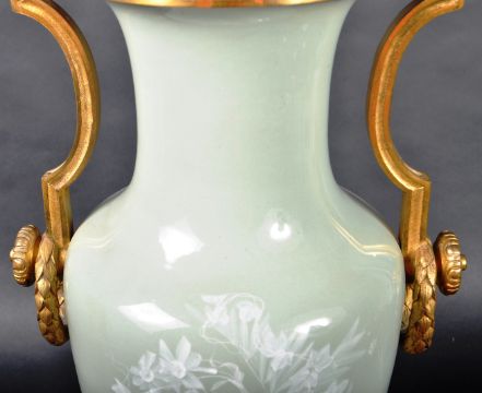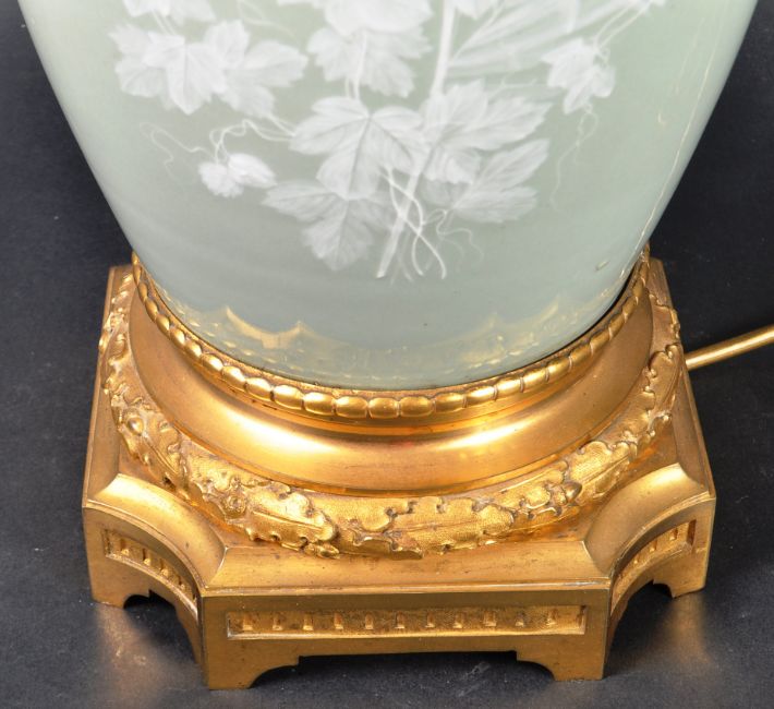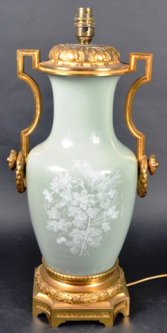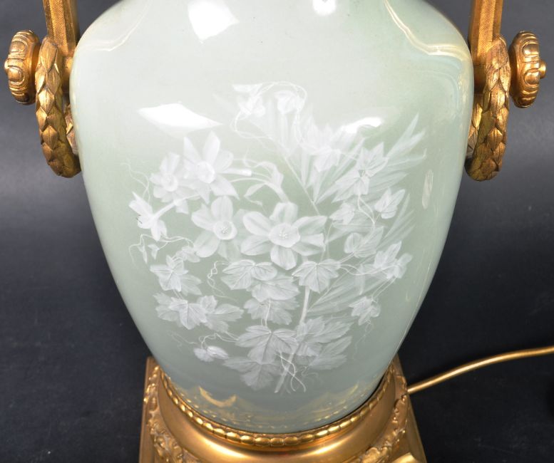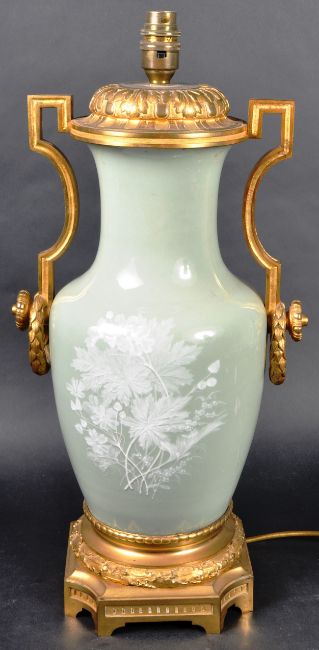 A 19th Century French porcelain and ormolu Pate Sur Pate table lamp comprising of a large Celadon glaze porcelain vase body decorated on both sides with flowers & leaves. The lamp set with ormolu bronze mounts to the lid and base with swag decorated handles. Measures approx; 46cm tall.