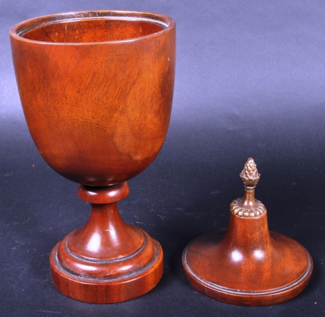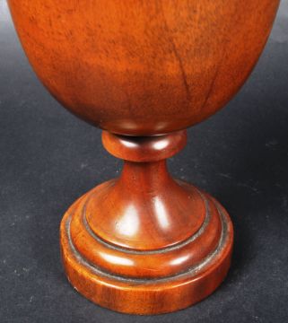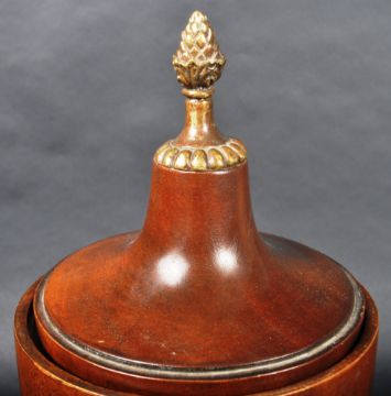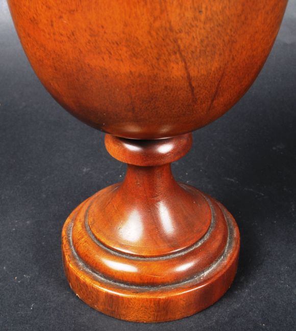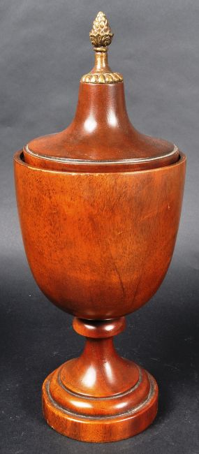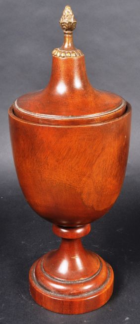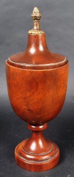 A 19th Century turned treen fruitwood tobacco pot / container of urn form with lid / cover. The lid surmounted by a metal pineapple finial to top. The turned wooden body raised on tapering ring turned column over a stepped circular base. Measures approx; 33cm tall.
