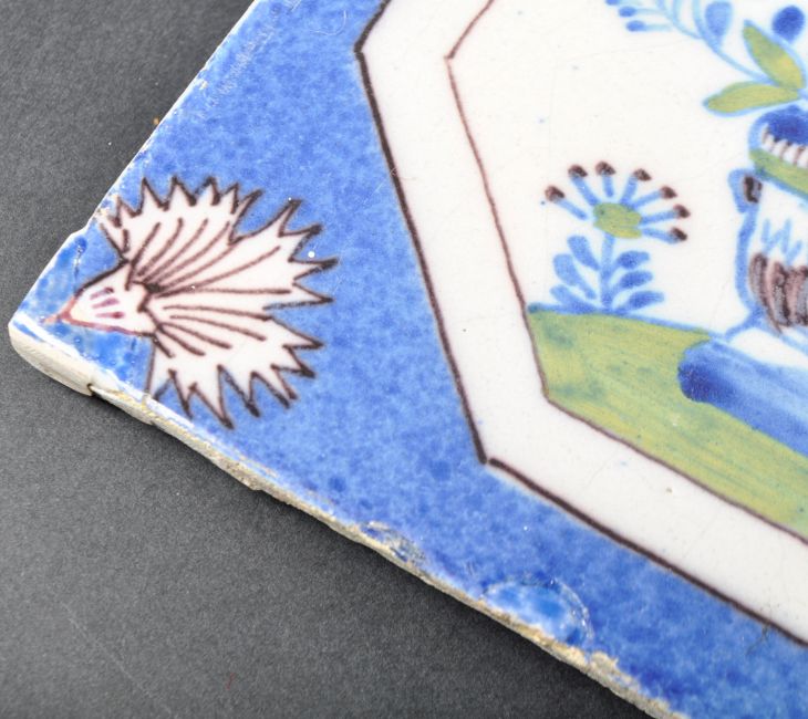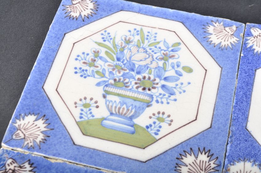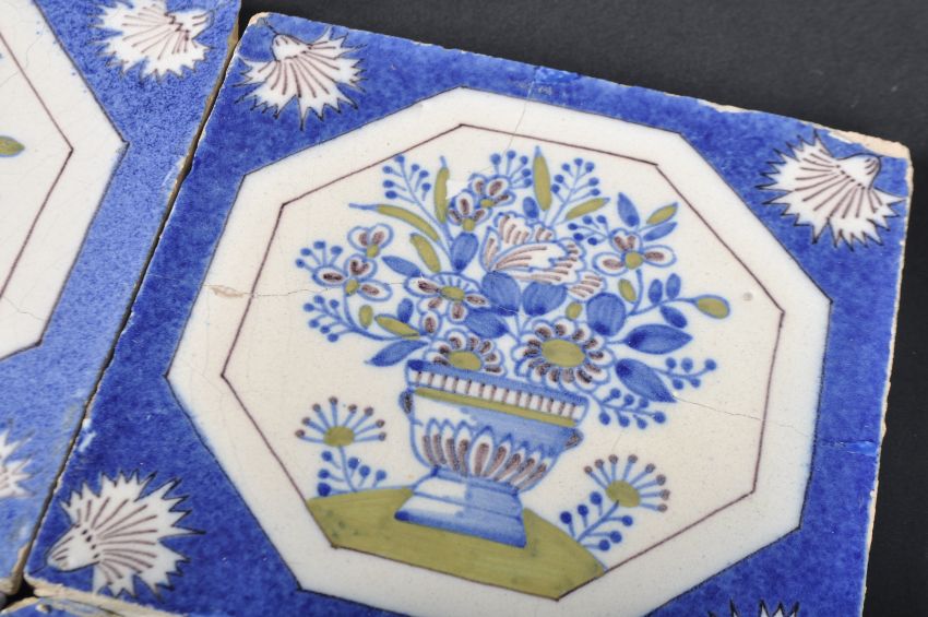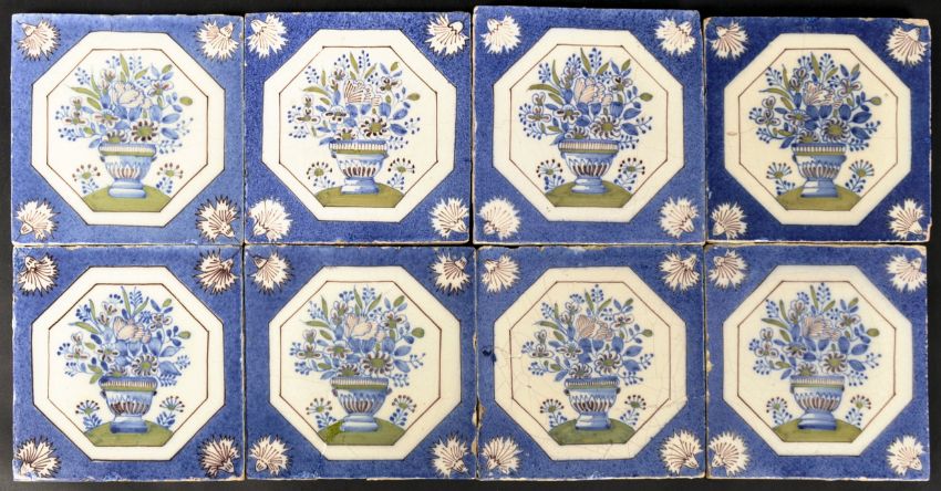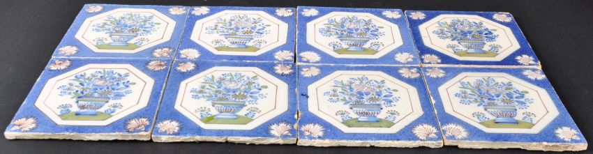 A set of eight 18th Century George II Bristol delft tiles having blue borders with central urns with sprays of flowers with further floral decoration to the corners. Some restoration to the some of the tiles. Each measures approx; 16cm x 16cm.