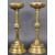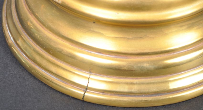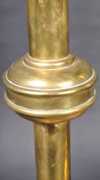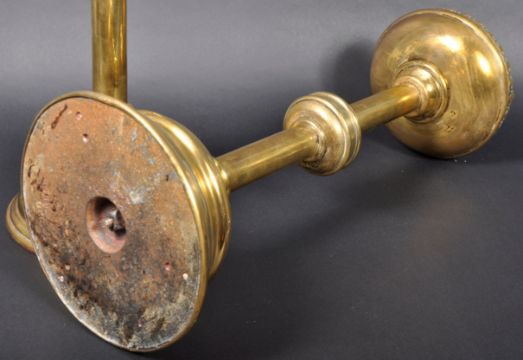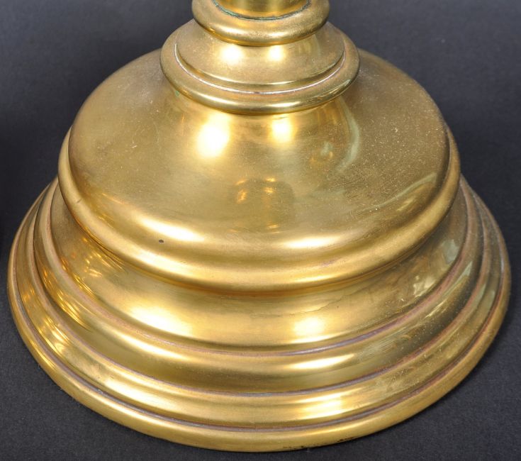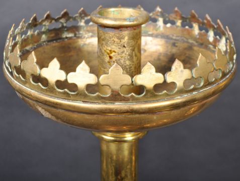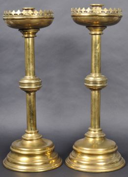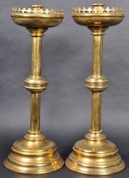 A large pair of 19th Century Gothic Ecclesiastical polished brass candlesticks in the manner of AWN Pugin for John Hardman & Co. The candlesticks having a large domed drip tray with trefoil pierced gallery and central sconce over a cylindrical column having a central baluster knop. All raised on a stepped pedestal base. Stamped to underside WB&R 926. In good condition with no visible signs of major damage. Measures approx; 46cm x 18cm.