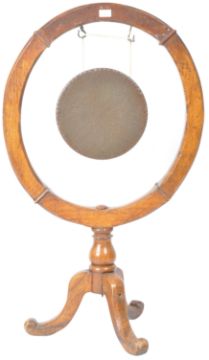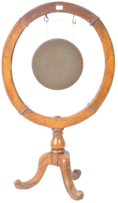 A 19th Century Victorian oak evening dinner gong having a circular carved oak frame with central hang brass circular gong. Raised on a single turned column upon tripod supports. Measures approx; 112cm x 66cm.
