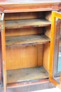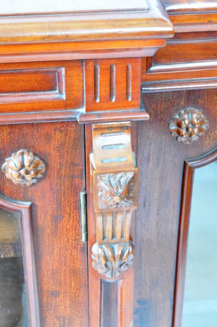 An large 19th Century Victorian mahogany breakfront library bookcase cabinet having and arched back rail over a chamfered edge top. Below a decorative carved frieze with flower head carved decoration with a central protruding double glazed door section with adjustable shelves within. The central cabinet flanked by further glazed door components to each side with all being raised on a plinth base Measures approx; 131cm x 160cm x 47cm.
