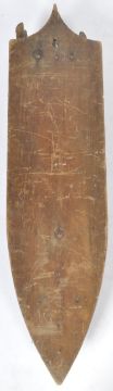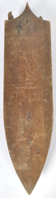 A 19th Century Aesthetic Movement hotel newspaper rack of pine construction having an elongated ebonised back with iron mount top with pine slats. Wear commensurate with age. Measures approx; 95cm x 24cm.