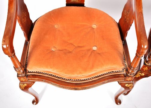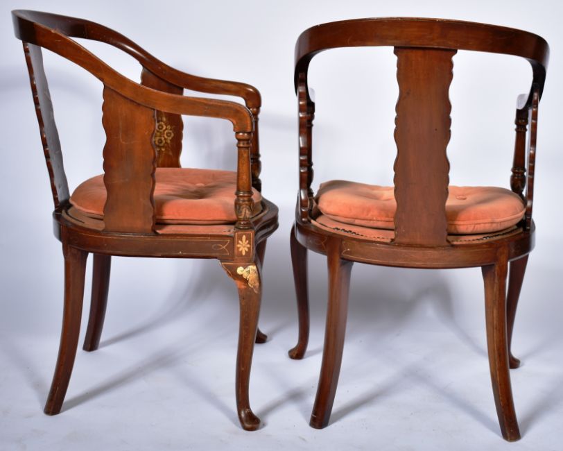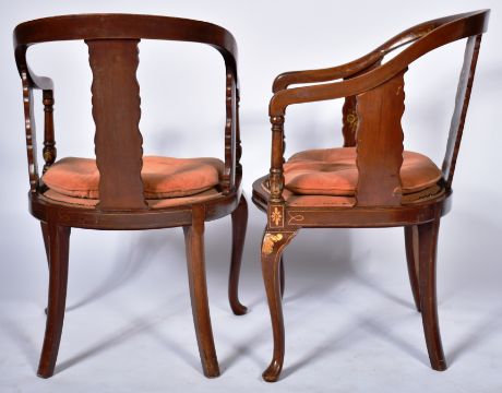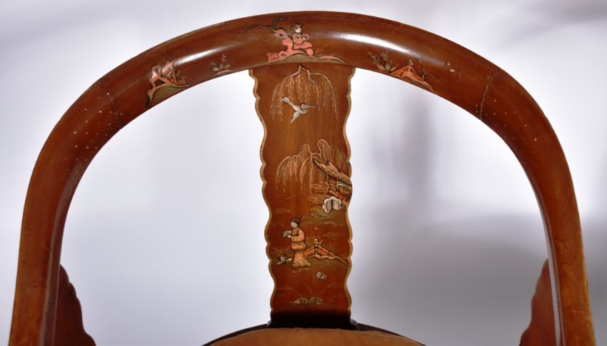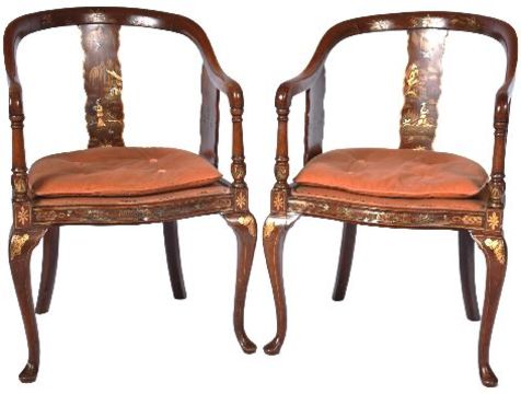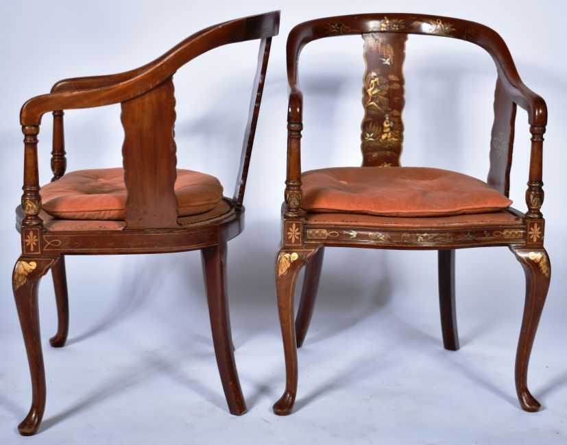 A matching pair of 19th Century English red lacquered chinoiserie decorated armchairs / carver chairs having curved backrest terminating to turned supported armrests. Single slate backrest with velour padded seat rests. Each raised on on cabriole supports. Each measures approx; 88cm x 53cm x 54cm.