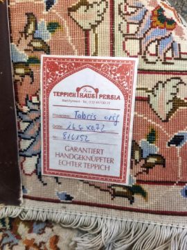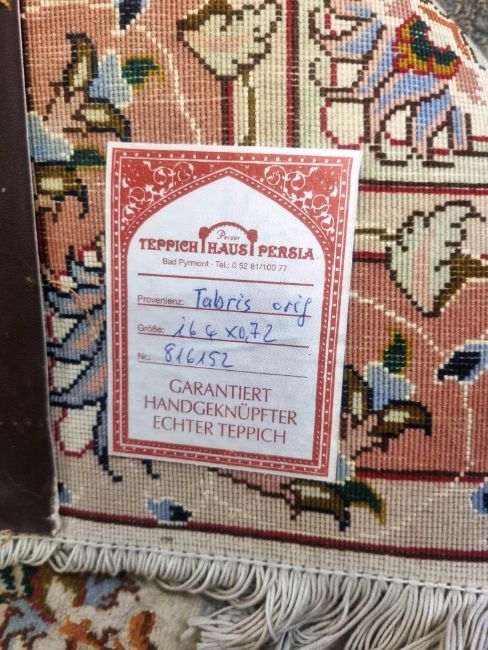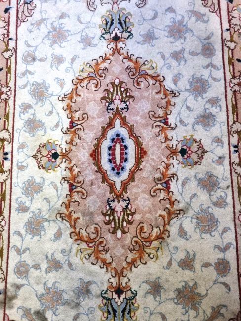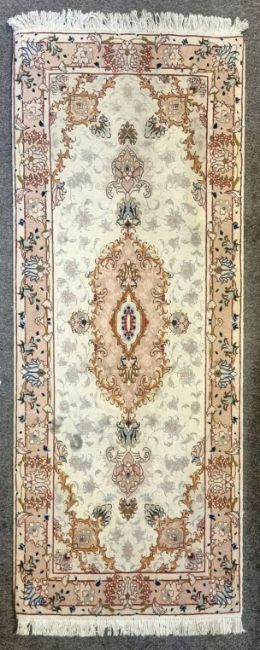 An early 20th Century Persian / Iranian Tabriz silk and wool on cotton hand knotted floor carpet rug. Central medallion on cream ground with scrolling botanical decoration set within a further decorated frame border in and having tasseled ends. Measures approx 160cm x 70cm. 250,000 knots per meter. Retailers label present.
