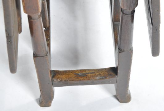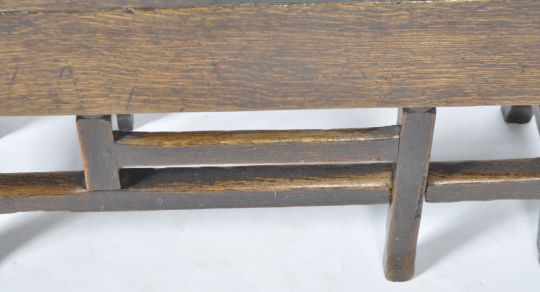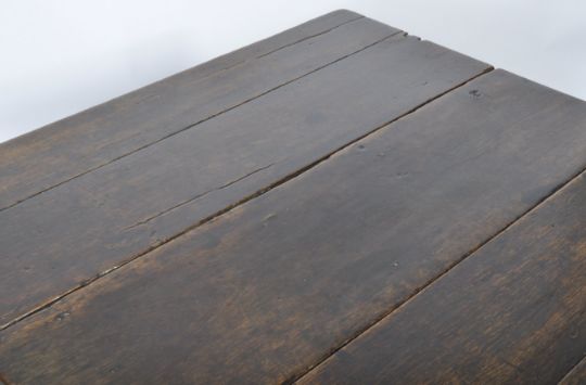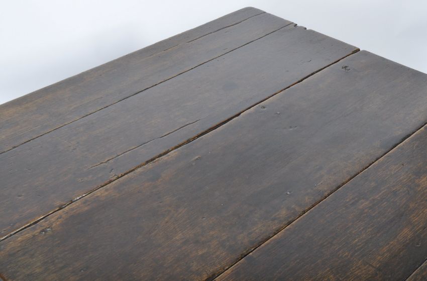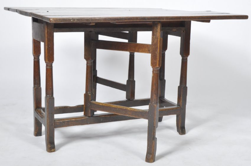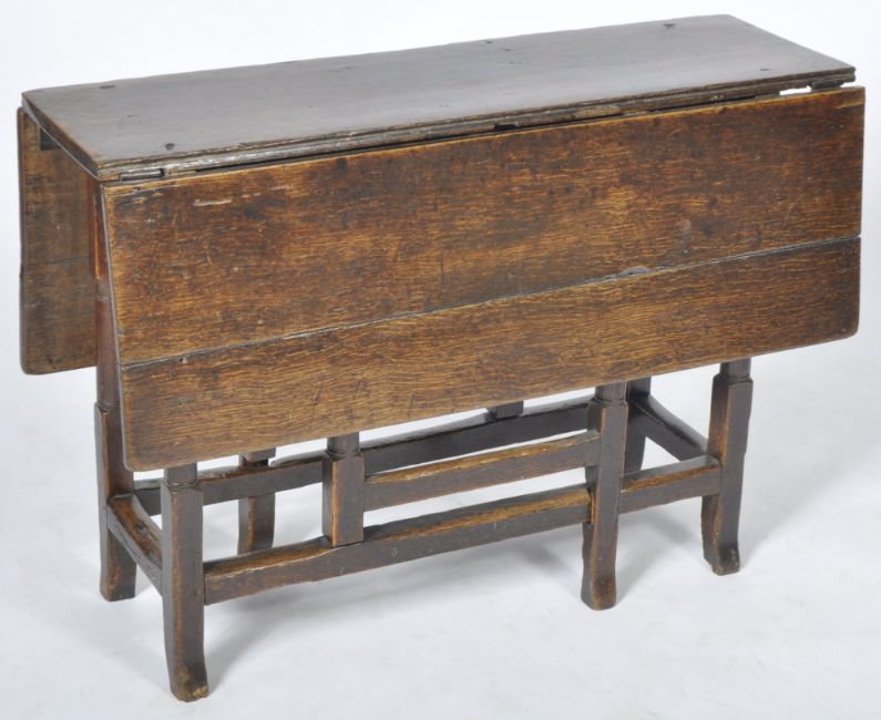 A 17th century country oak drop leaf / gate leg dining table. Raised on squared legs with gate action supporting drop leaves either side of the rectangular table top. Measures approx; 70cm x 99cm x 29cm when closed. (95cm open)