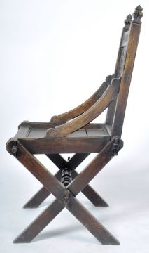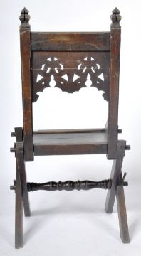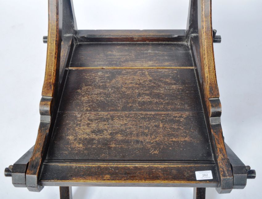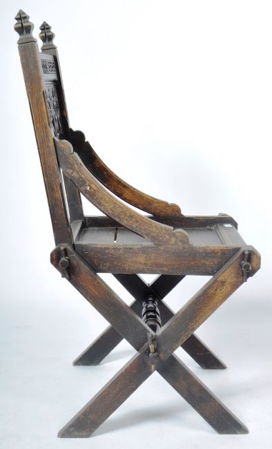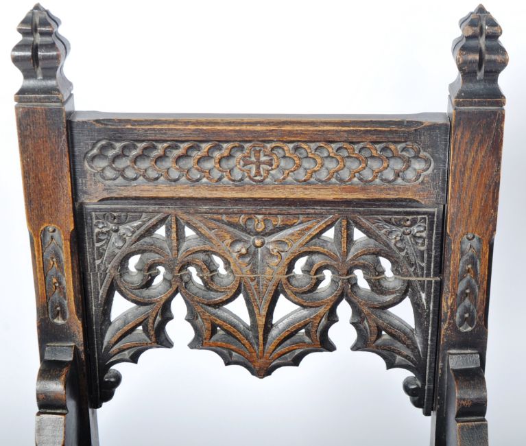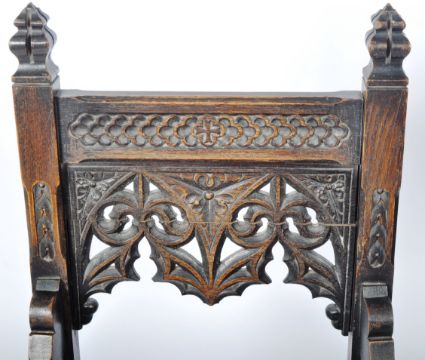 A 19th Century Victorian oak Glastonbury Ecclesiastical Gothic hall chair in the manner of AWN Pugin. Comprises a carved backrest with quatrefoil & cross decoration with pierced Gothic archways, sweeping ides and blanked seat over an 'X' frame peg jointed / pegged joints base united by a large turned stretcher. Small split to seat and other wear commensurate with age. Measures approx; 105cm x 60cm 54cm.
