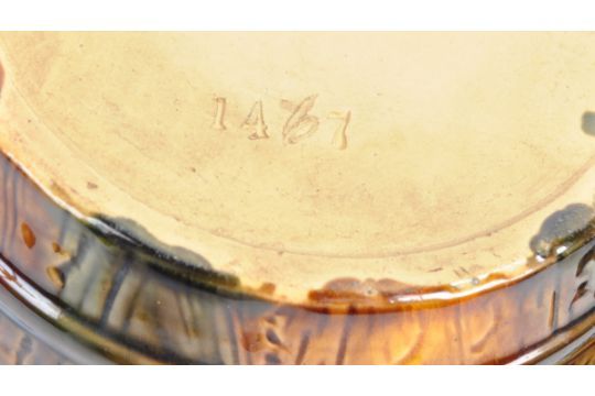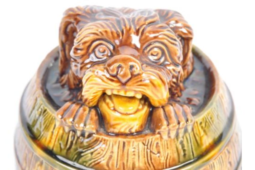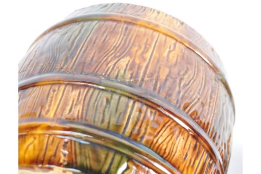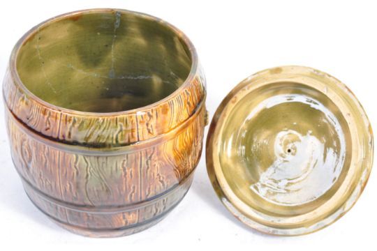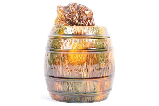 A 19th Century Victorian pottery tobacco jar in the form of a of peering out of a barrel. Coloured glaze with detailed facial features and paws. Impressed number 1467 to base. Has been restored. Measures approx; 18cm tall.