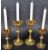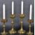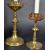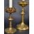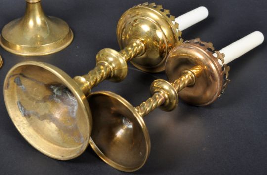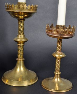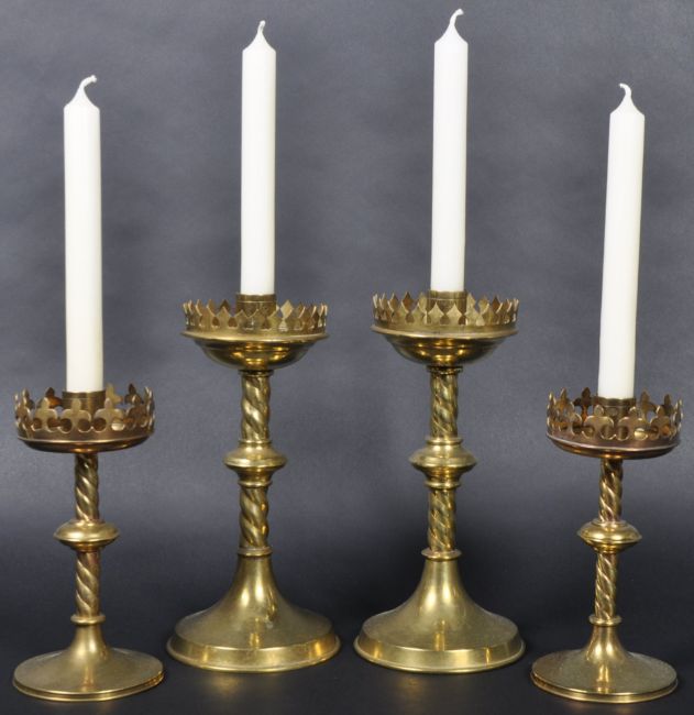 Two pairs of 19th Century Gothic Ecclesiastical polished brass candlesticks in the manner of AWN Pugin for John Hardman & Co. The candlesticks having a domed drip tray with trefoil pierced gallery and central sconce over a sugar cane barley twist column having a central bladed knop. All raised on a stepped pedestal base. In good condition. Measures approx; 20cm tall.