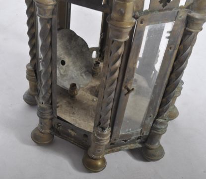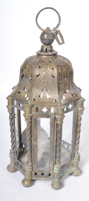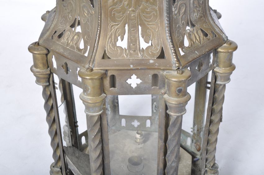 A late 19th Century brass worked hanging lantern having a large hanging hoop atop with embossed faces below to the sweeping panels. Below a glass octagonal section interspersed with twisted brass supports with ball finials below. Lose and damage to some of the glass panels. Measures approx; 82cm x 40cm diameter.