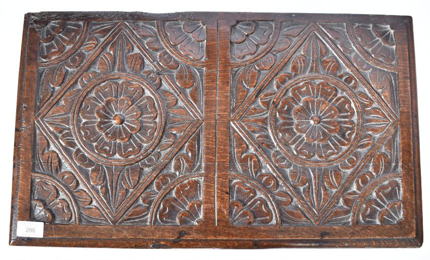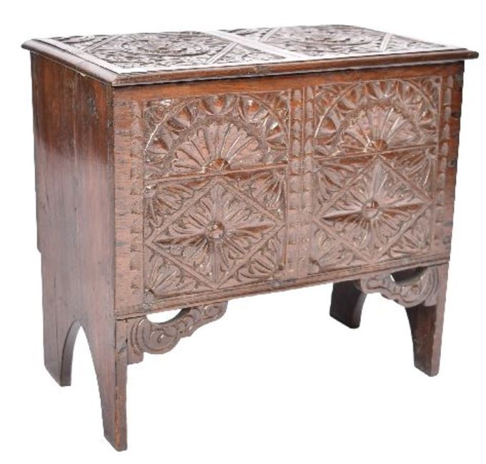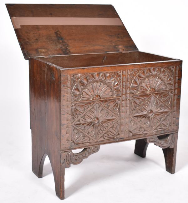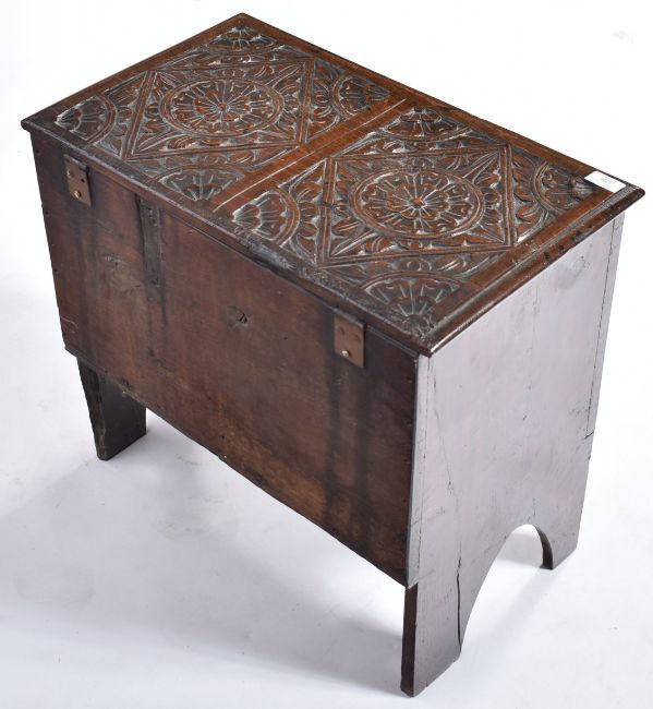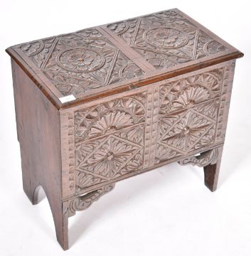 A 17th Century carved oak coffer chest of small proportions. The box with hinged lid opening to reveal a spacious interior set with carved panels throughout. Measures approx; 53cm x 59cm x 34cm.