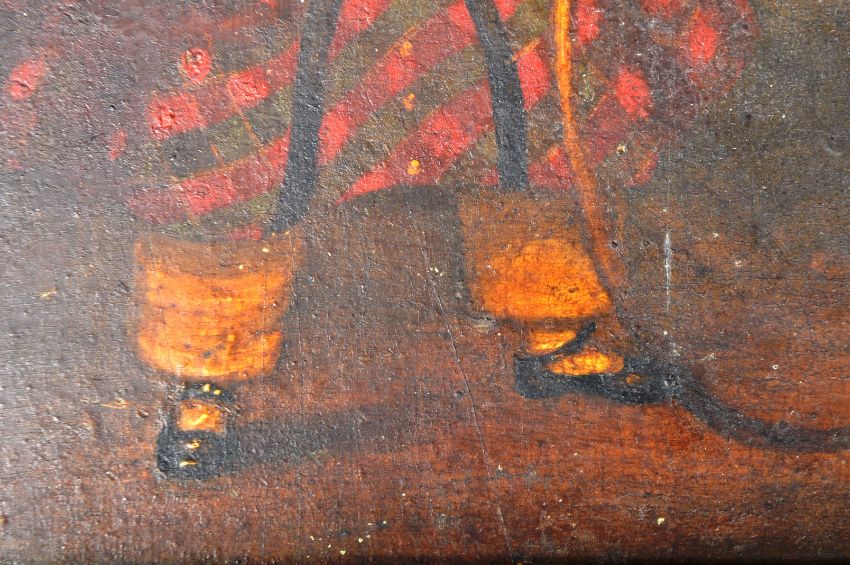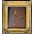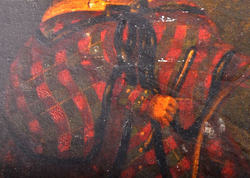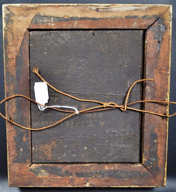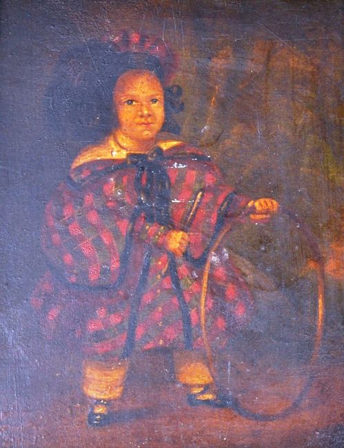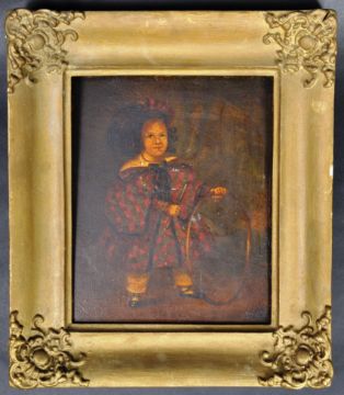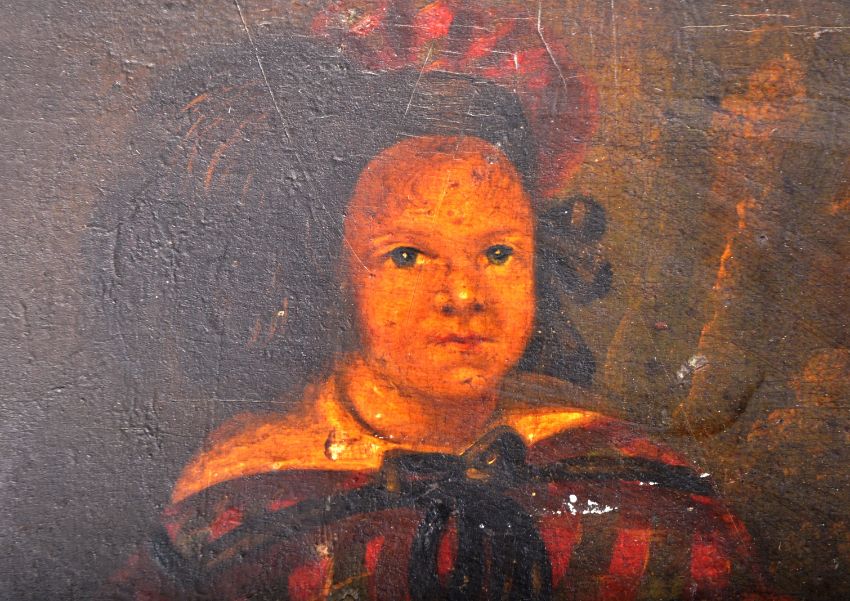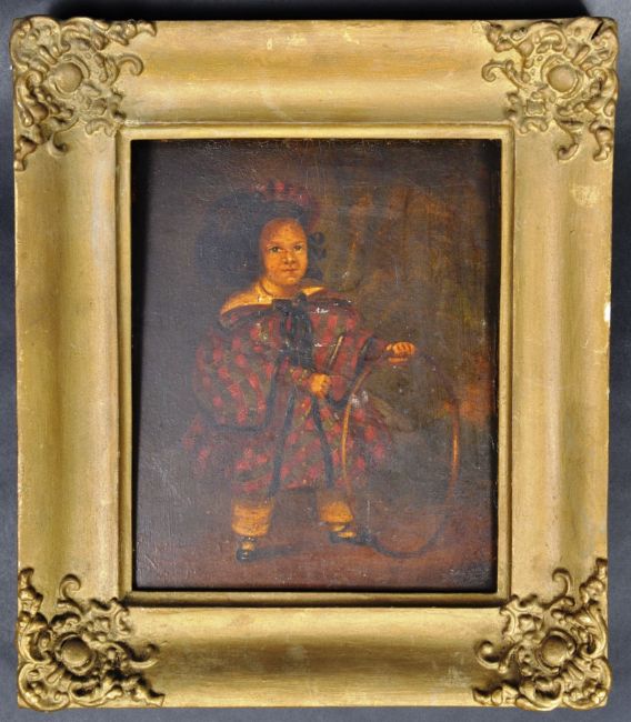 A mid 19th Century Victorian oil on board juvenile portrait painting depicting a young child in period red checkered attire playing with a hoop and stick. Marked to verso A.T. Hill Junior 46 Bartholomew Road Exeter 1840's. Set on an ornate gilt painted frame. Measures approx; 33cm x 30cm.