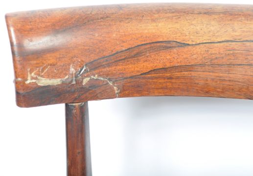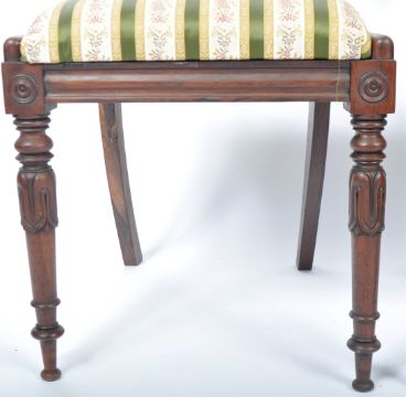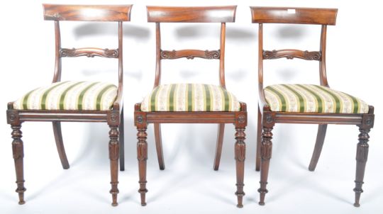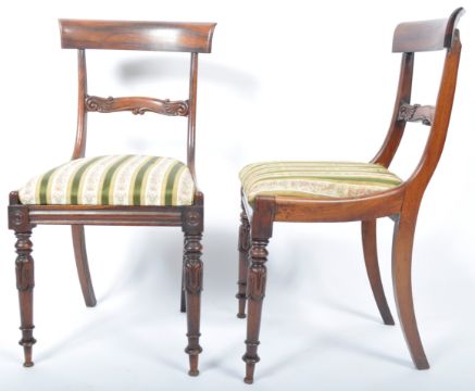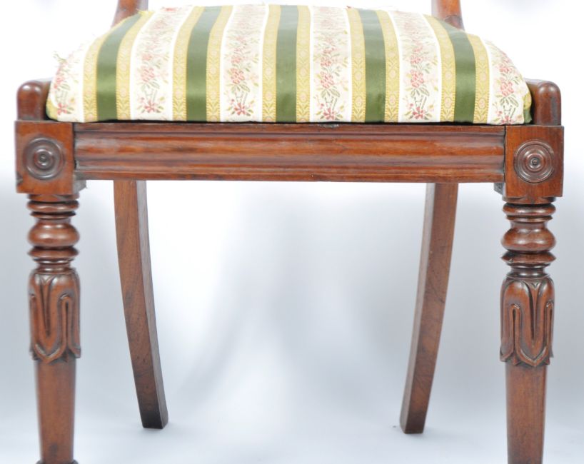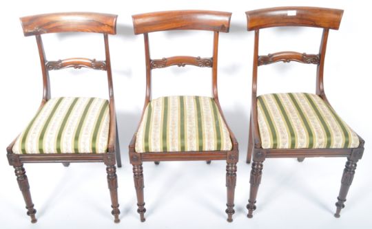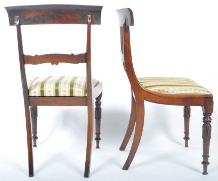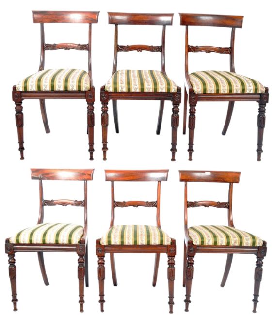 A set of six 19th Century Regency rosewood bar back dining chairs in the manner of Gillows of Lancaster having a shaped bar back with decorative carved rail. Drop in striped Hepplewhite type fabric raised on tapering turned legs with carved bulb and knop detailing. Some chairs having early professional repairs. Measures approx: 86cm x 46cm x 46cm.