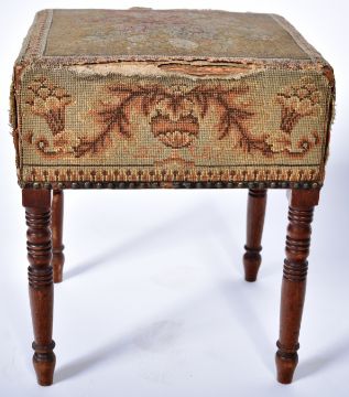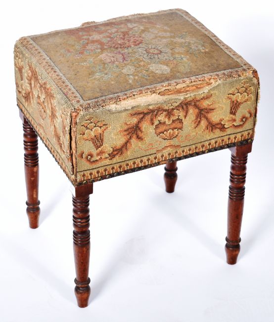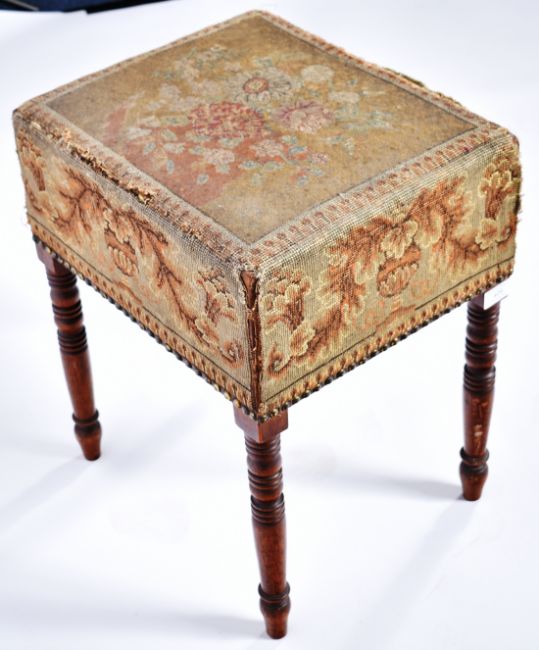 An early 19th Century George III stool having an urn and flower tapestry cushioned top with stud detailing. All raised on turned tapering supports. Wear to the top in places. Measures approx; 49cm x 41cm.