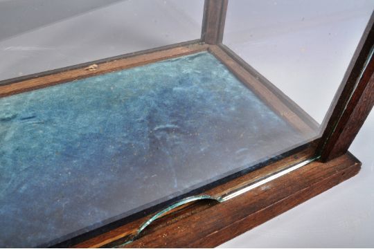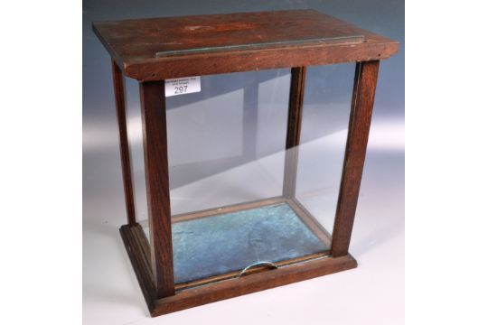 A 19th Century Victorian taxidermy specimen collectors display vase having an oak frame with glazed glass panels and removable glass lift up door. Blue silk lined base. Stepped pediment top and base. Measures approx; 31cm x 30cm x 20cm.