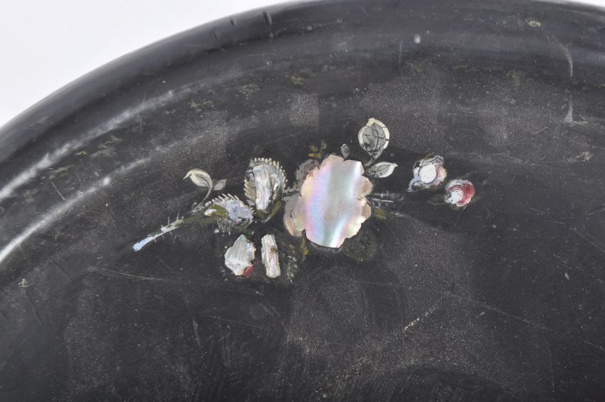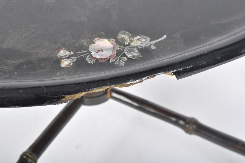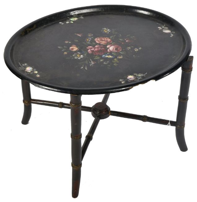A 19th Century papier mache tray on stand. The tray having a scalloped edge with gilt edge and hand painted floral spray on black lacquer ground. Raised on a matched faux bamboo Aesthetic movement base. Tray measures approx; 60cm x 47cm.