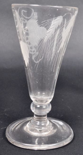 A collection of seven early 19th Century George III hand-blown dwarf ale drinking glasses comprising a hop and barley engraved examples, green Wrythen example, knob stem etc. No visible damage across all seven. Largest measures approx; 16cm tall.