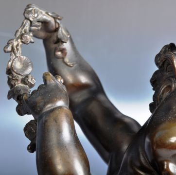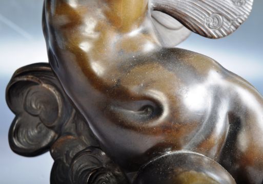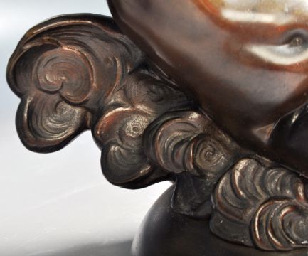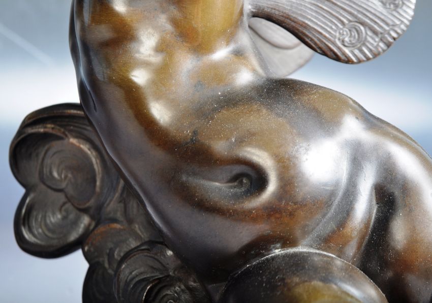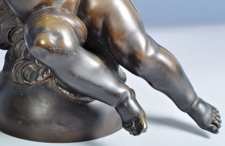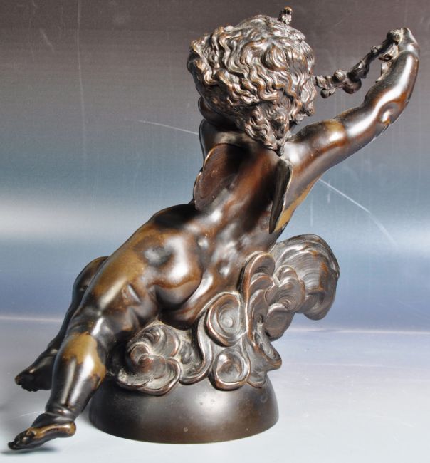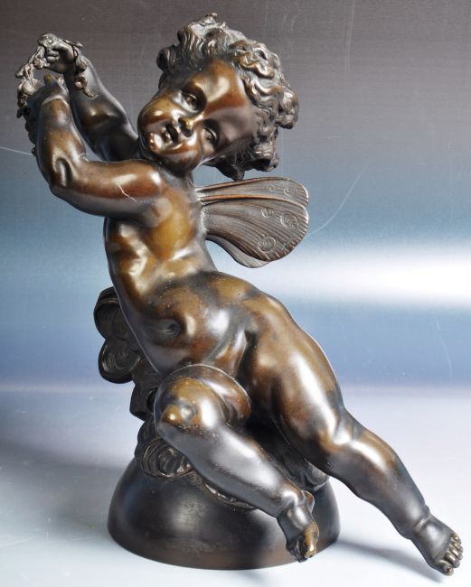 A 19th Century large bronze figurine of a cherub putti. The figure depicted in flight holding a laurel wreath with detailed facial features. Raised on a cloud and set to an domed circular base. Measures approx; 28cm tall.