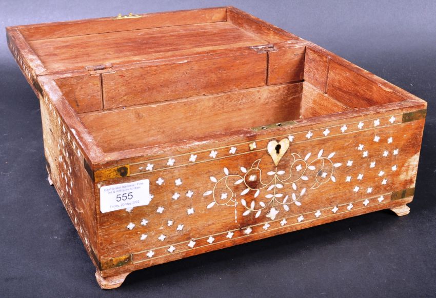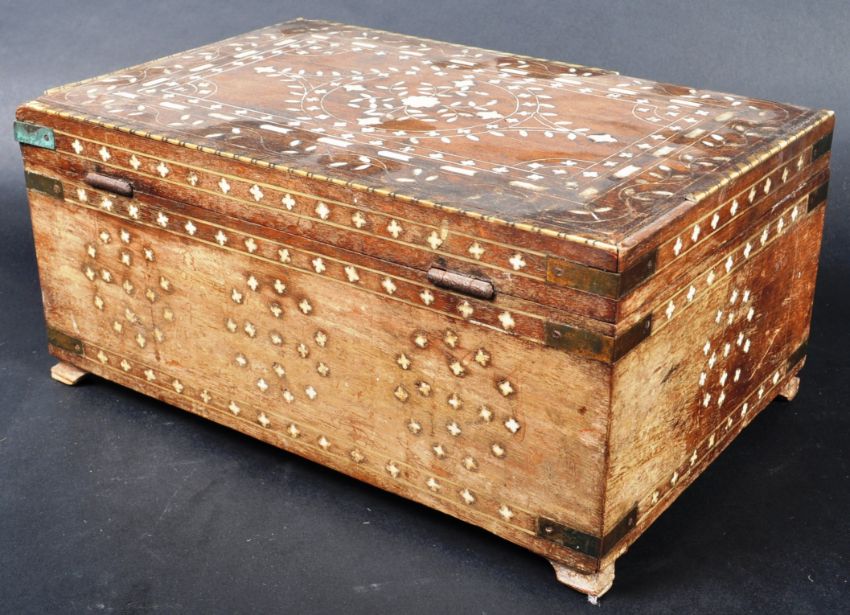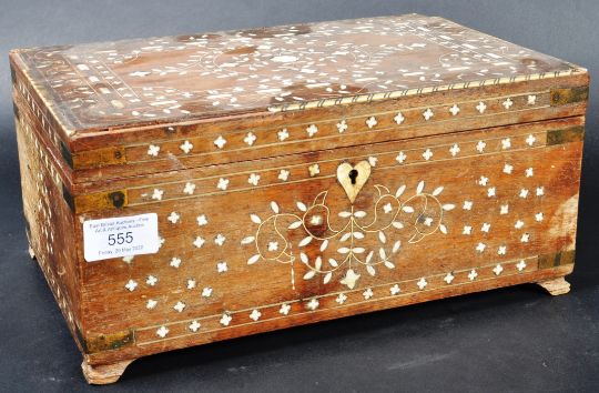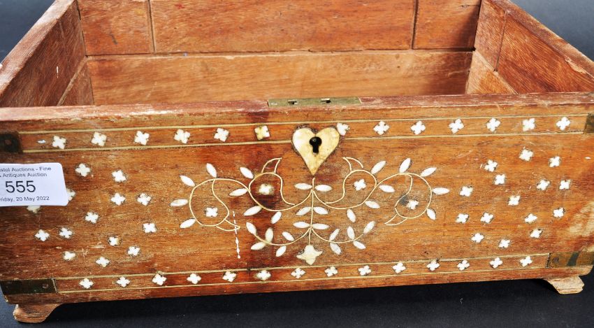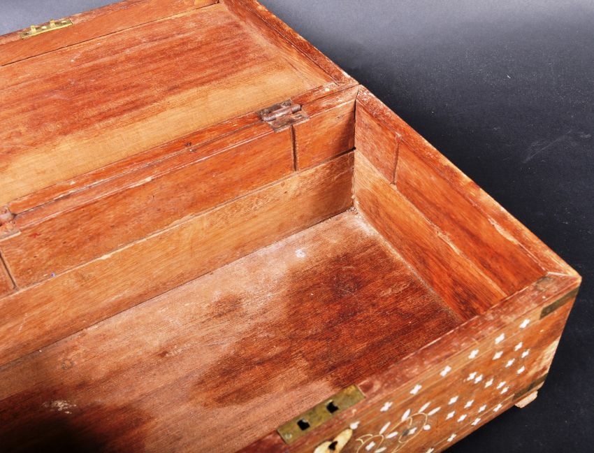 A 19th Century Indian sandalwood and ivory inlaid box casket of rectangular form having delicate ivory inset repeating patterns to each side. The hinged lid opening to reveal a spacious interior. Measures approx: 15cm x 31cm x 21cm.
