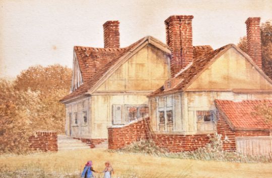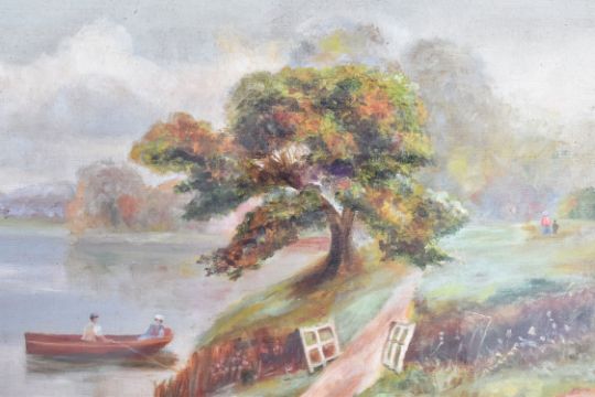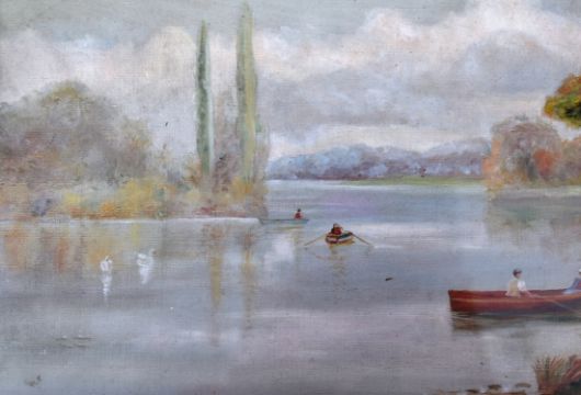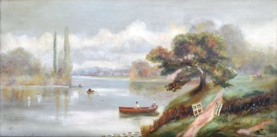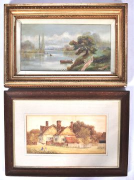 A pair of watercolours depicting countryside scenes. The first shows a farmhouse / cottage in front of a wooded background whilst two small girls play in the fields in the foreground, monogrammed to bottom right. The second painting shows a riverside scene with figures in rowing boats whilst swans swim nearby. Both framed & glazed. Condition; age related wear & tarnishing to be expected but no signs of major damage or repair. Largest measures approx; 56cm x 37cm.