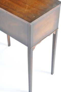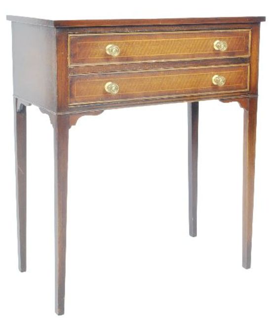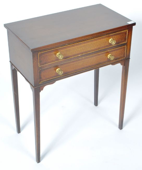 A 19th Century mahogany nightstand bedside table comprising of a overhanging square top with bank of two small drawers set with gilt metal pull handles. Inlaid with satinwood and raised on tapering square legs. Measures approx; 72cm x 61cm x 34cm.