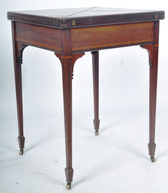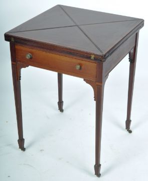 A 19th Century Victorian mahogany envelope card / games table having a four section folding metamorphic top with inlaid borders revealing green baize playing area. Single drawer to the frieze and raised on tapering leg with spadefoot with brass castors. Measures approx when closed; 76cm x 59cm x 55cm.