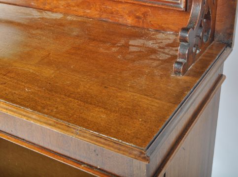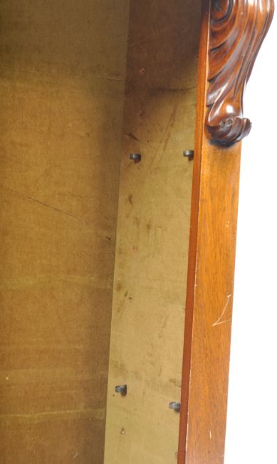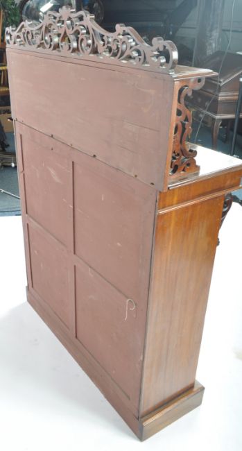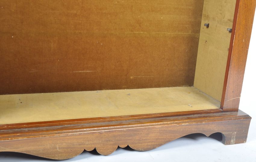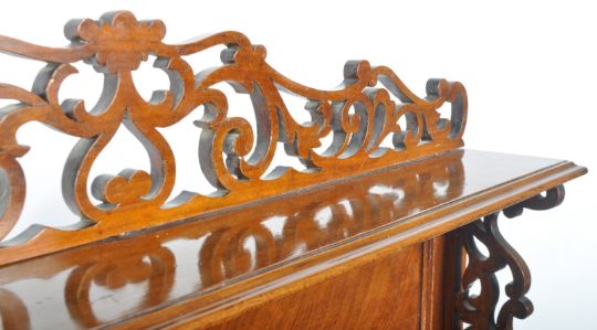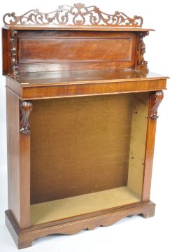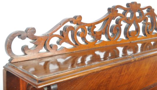 A 19th Century Victorian mahogany open bookcase having a carved scrolled folate top with shelf below supported by further carved sides. Open bookcase below with adjustable shelves set within. All raised on a plinth base. Measures approx; 144cm x 97cm x 35cm.