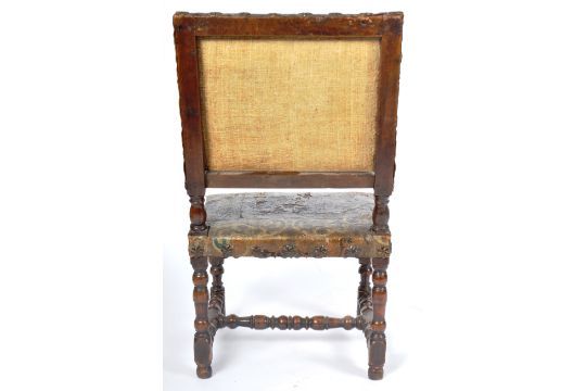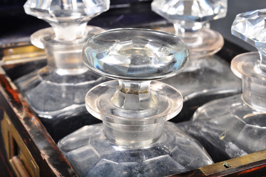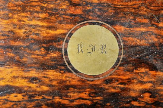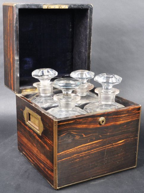 A 19th Century coromandel veneered and brass bound liqueurs box tantalus having brass bound borders with a central inlaid brass cartouche atop the lid monogrammed R . F . R. The hinged lid opens to reveal a fully appointed interior with leather and velvet lined walls housing the four decanters within each having a stopper's atop. To the exterior folding brass recessed campaign handles to sides. Measures approx. 27cm x 24cm x 24cm.
