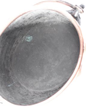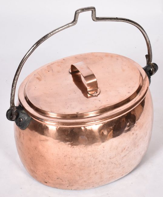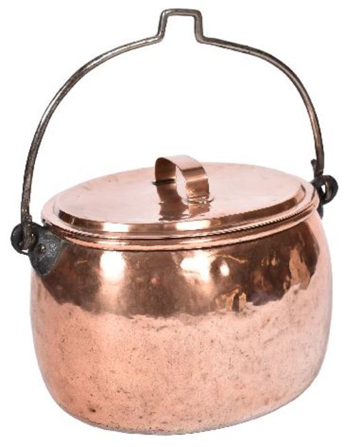 A large 18th Century George III copper cauldron with lid. The cauldron / cooking pot of oval shape with steel applied wing handles to sides. Measures approx 33cm x 48cm x 38cm.