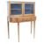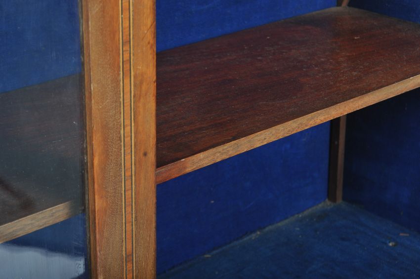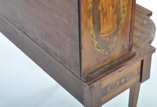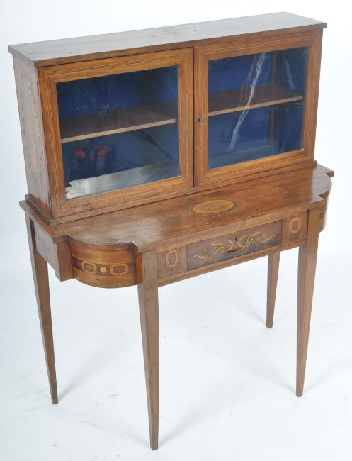 A 19th Century Italian mahogany and specimen wood inlaid ladies Bonheur de jour writing table desk having a double glazed door cabinet vitrine top with shelf set within and Neoclassical inlaid ladies decoration the the exterior. Further inlaid detailing the single drawer base with all raised and supported on straight tapering supports. Measures approx; 113cm x 90cm x 43cm.