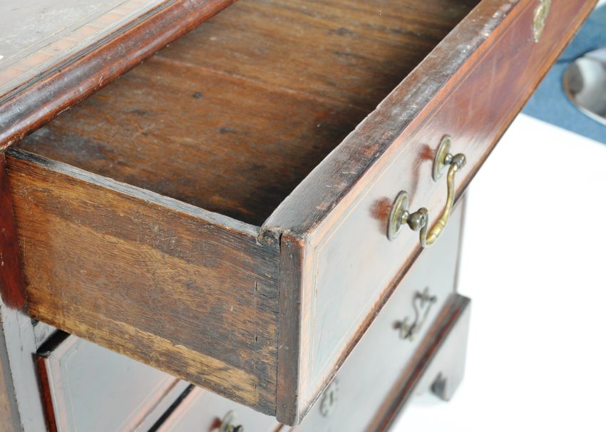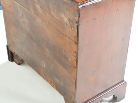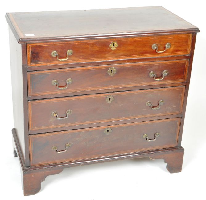 An 18th Century George III mahogany and walnut crossbanded bachelors chest of drawers. The bank of four straight drawers having a chamfered edge top with brass swing handles on circular backplates flanking armorial lock escutcheons. All raised on bracket feet. Measures approx; 84cm x 88cm x 44cm.