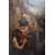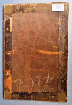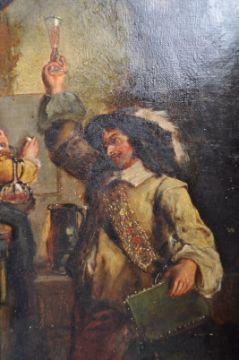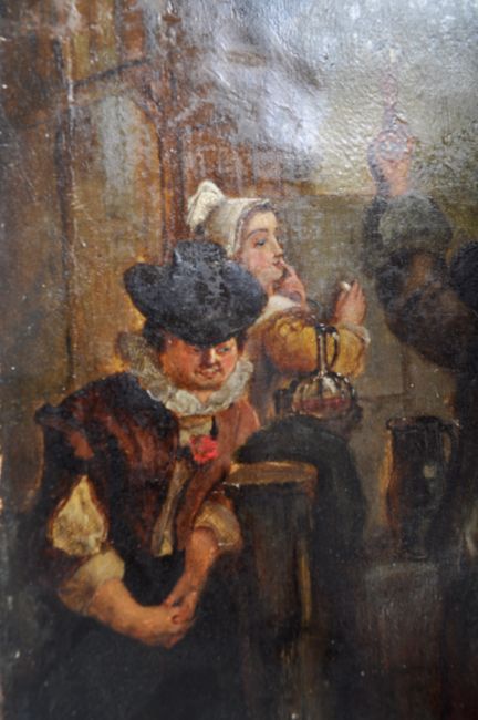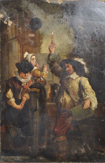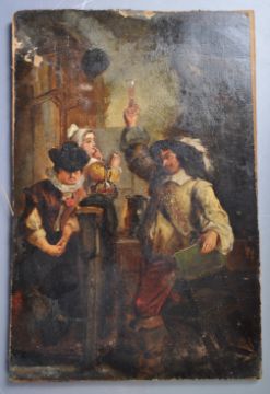 A 17th Century oil on canvas Dutch painting depicting a Flemish scene with gent raising an ale glass for a toast with another figure seated on the left and maiden behind. The interior scene busy with various period objects. Unframed. Some wear to top section. Measures approx; 33cm x 21cm.