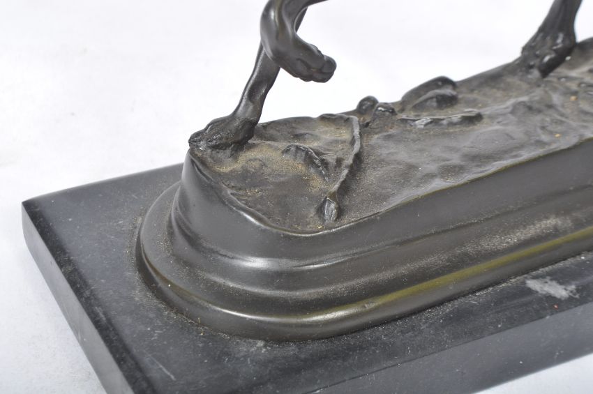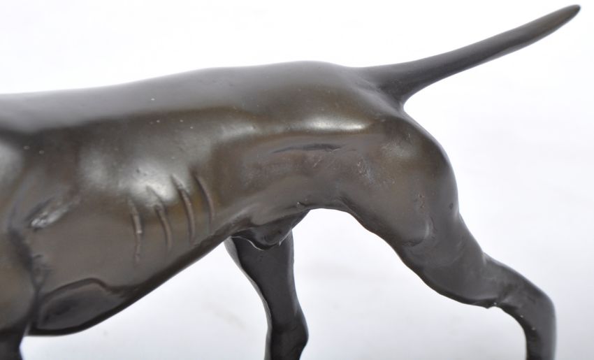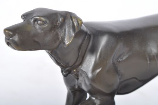 Jules Moigniez (French, 1835-1894) - A bronze statue figurine depicting a hunting hound setter pointer dog. The dog raised on naturalistic stepped oval base with front paw raised. Cast signature to base and raised on black marble base. Measures approx; 22cm x 30cm x 13cm.