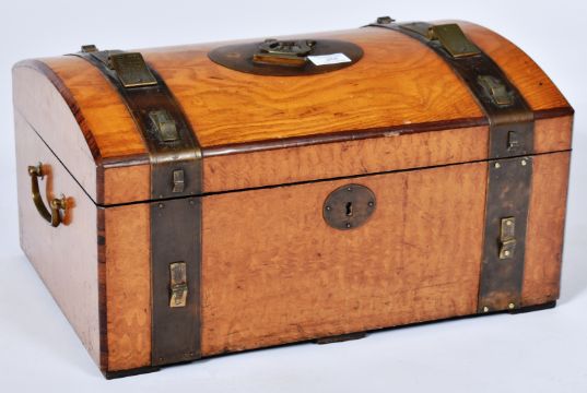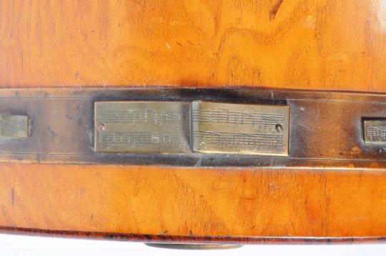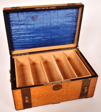 A 19th Century Victorian pollard oak music conductor's score sheet box of large size having relief cast bronze mounts depicting music sheets and harp. Bronze swing handles to sides with interior later fitted and blue baize lined. The top signed with name. Measures approx; 24cm x 48cm x 32cm.