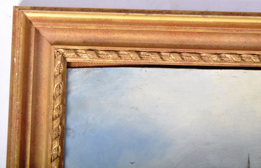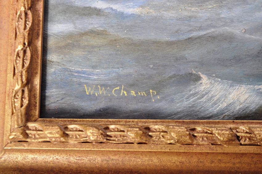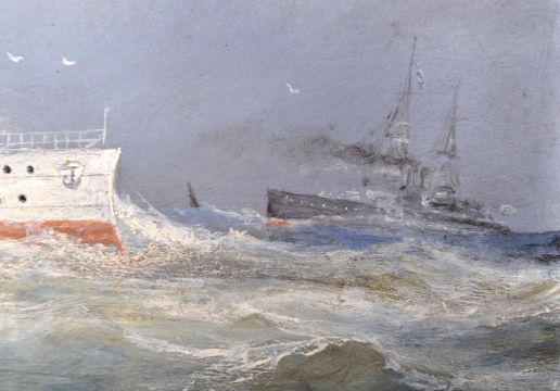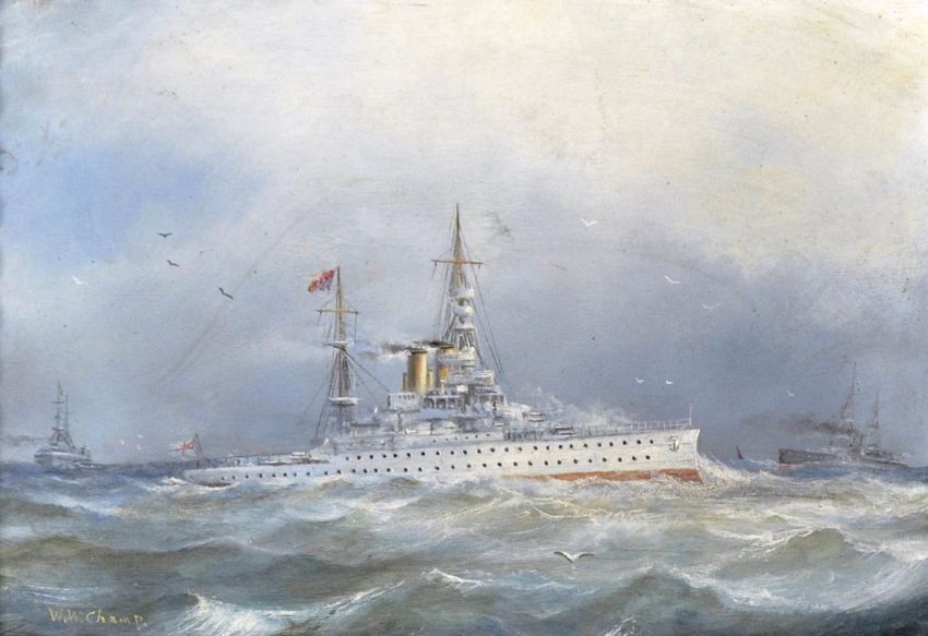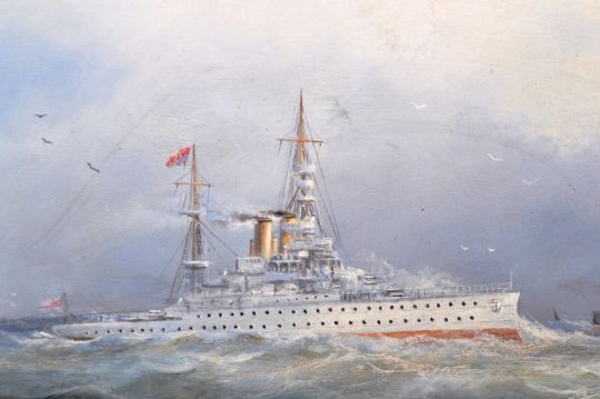 WW Champ - An early 20th Century oil on board painting depicting the ship HMS Barham a Queen Elizabeth Class Battleship with other vessels / boats upon the sea with gulls in flight. Signed by artist to lower right corner. HMS Barham was launched in 1914 and sunk by a U-boat in 1941. Frame measures approx 40cm x 52cm.