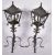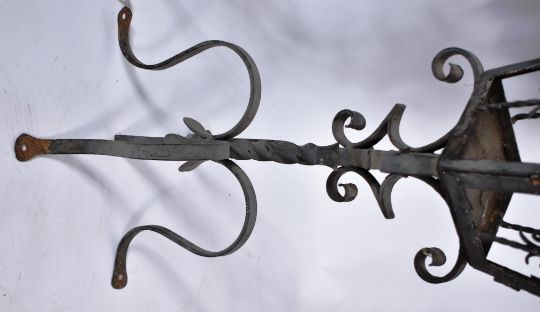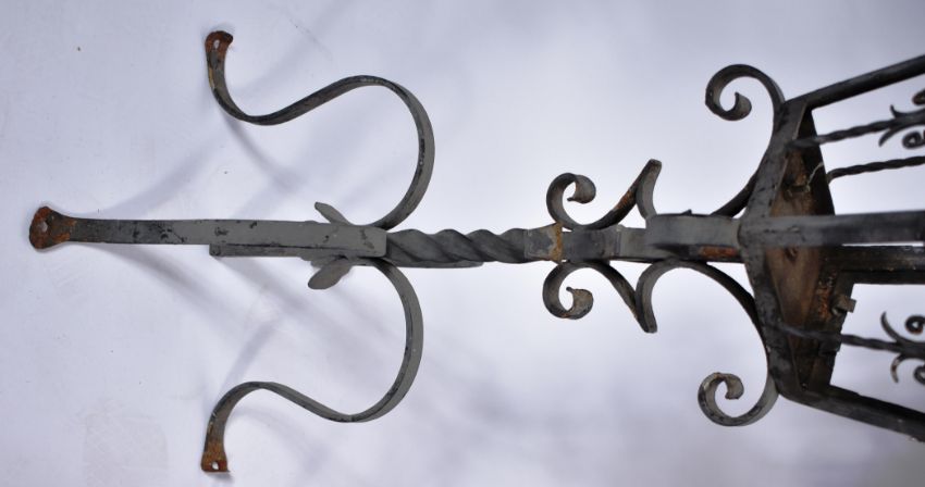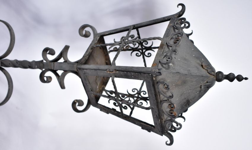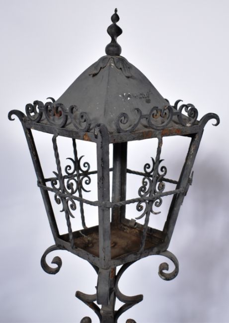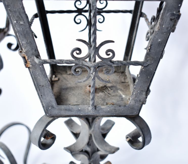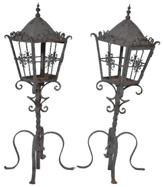 A matching pair of 19th Century Victorian cast iron post lanterns of decorative form. Each lantern having twist finial tops with worked iron scrolled surround below. Open cage section with further twist supports with each raised on four scrolled mounts. Wear commensurate with, overall good examples. Each measures approx; 90cm tall.