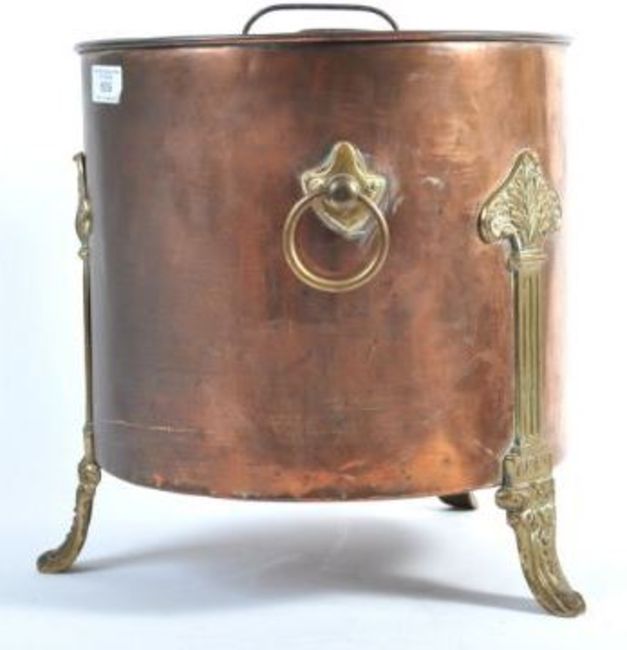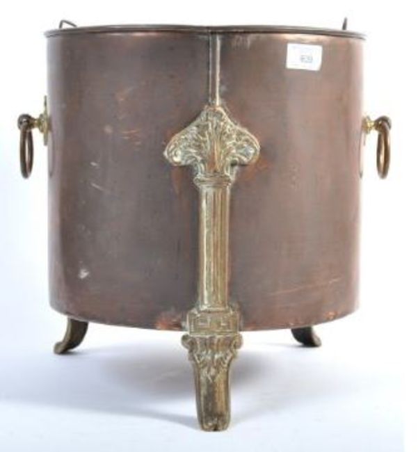 A 19th Century brass and copper wine cooler of classical form. The main body being brass with applied brass reeded column and scroll leg mounts. Complete with inset liner. Measures approx: 34cm x 31cm.