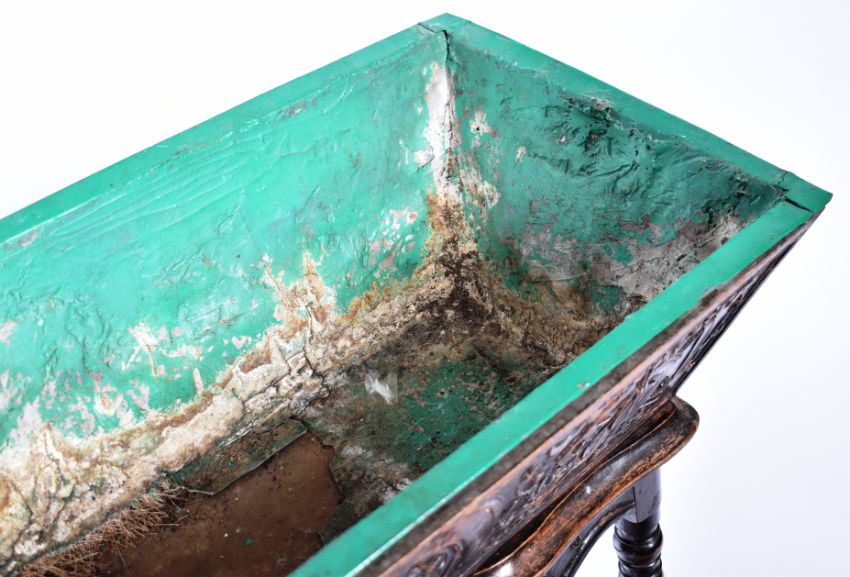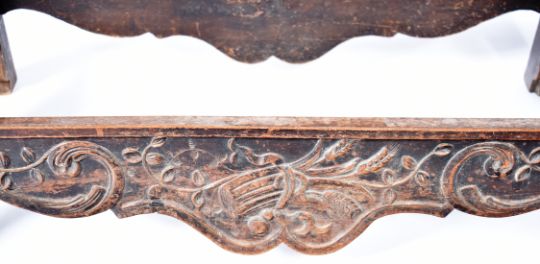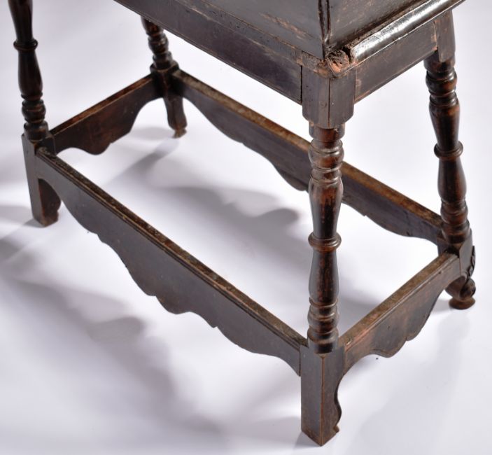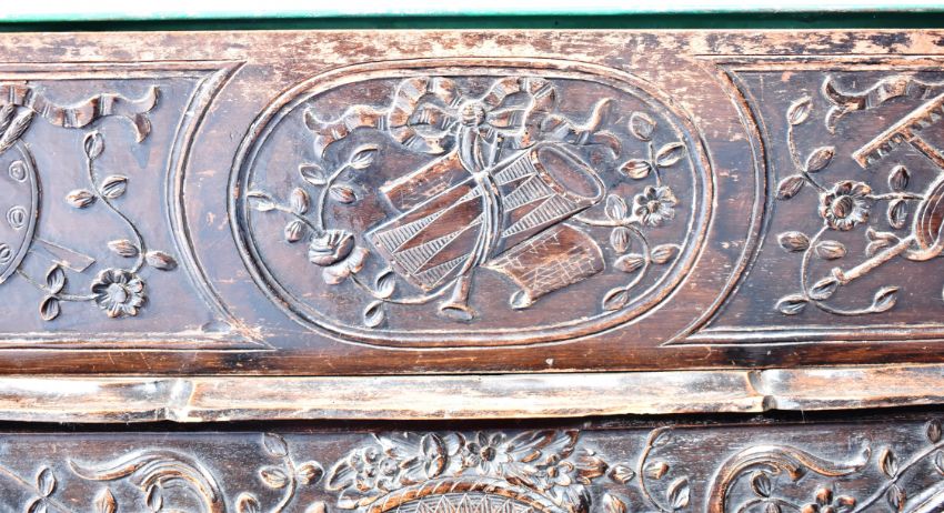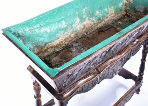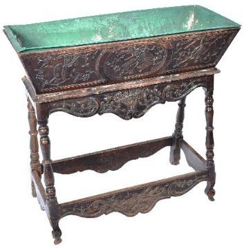 An 18th Century George II carved walnut dough bin having later been converted into a planter. Green painted metal insert with carved panels with further carved aprons below. All raised on block and turn supports with further carved shaped panels uniting the legs. Wear commensurate with age. Measures approx; 91cm x 94cm x 39cm.