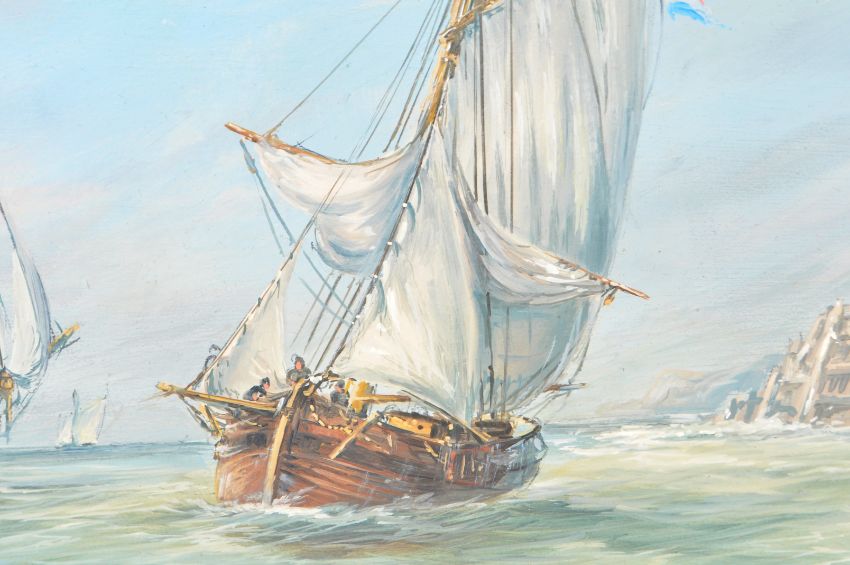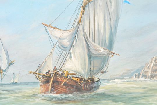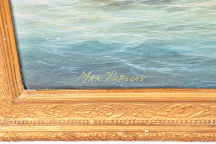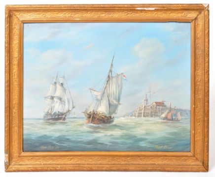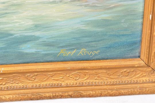 Max Parsons ARCA (British 1915-1998) A 20th Century oil on board painting entitled Fort Rouge. Depicts the Fort with Sloop boat entering, central single masted ship and a twin masted galleon. Signed and titled by artist. Measures approx; 37cm x 50cm. Frame measures approx; 48cm x 60cm.