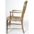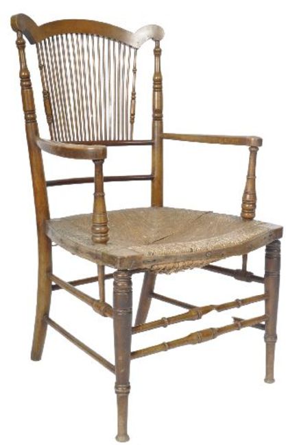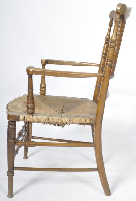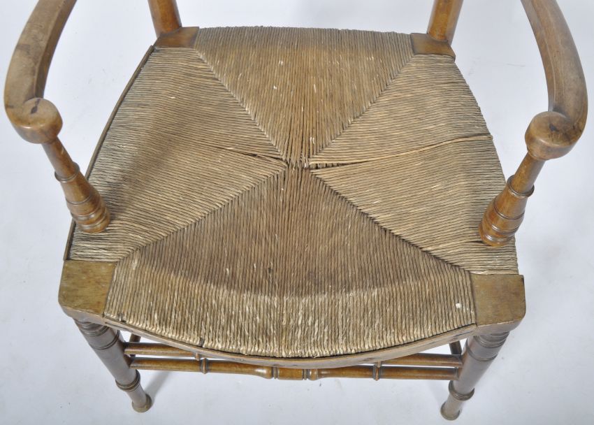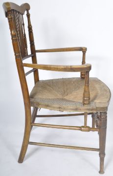 A 19th Century Arts & Crafts armchair having a shaped top rail with central spindle backrest flanked by further turned supports. Bowed scrolled armrests with rush seat rest below with all raised and supported upon stuned tapering supports united by turned stretchers. Wear commensurate with age. Measures approx; 95cm x 50cm x 55cm.