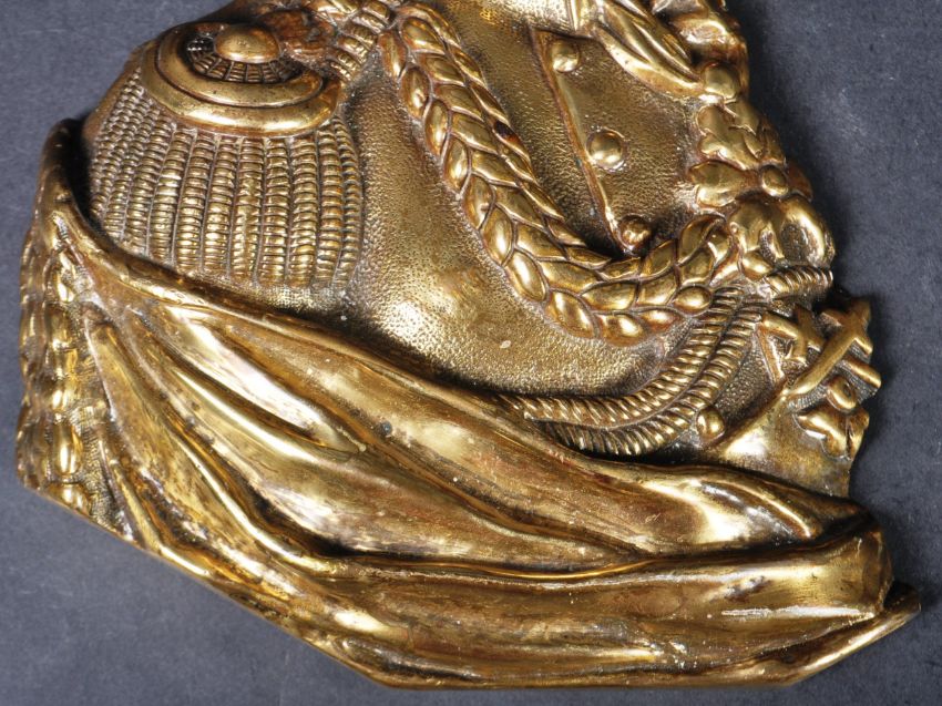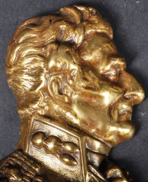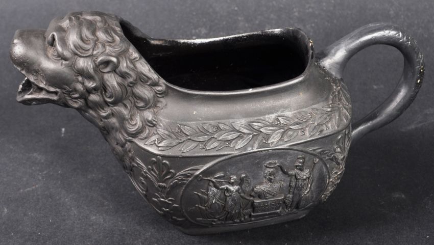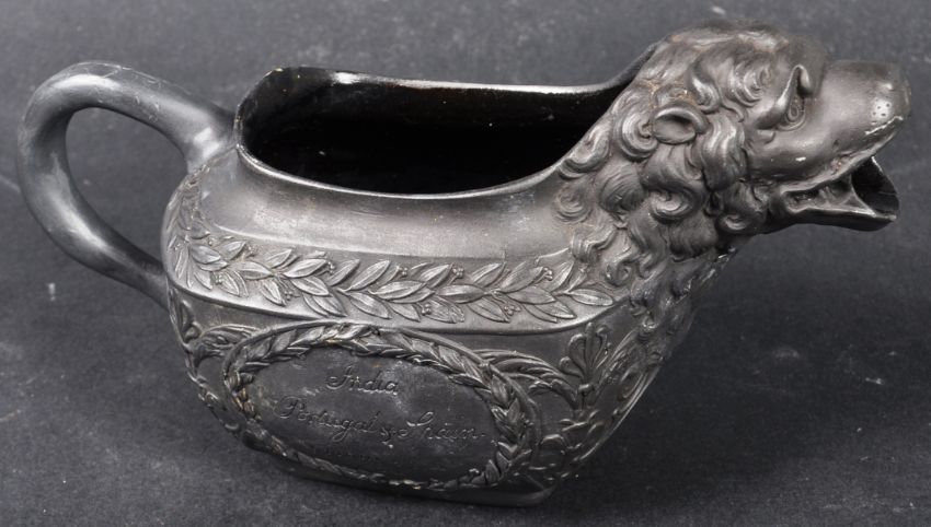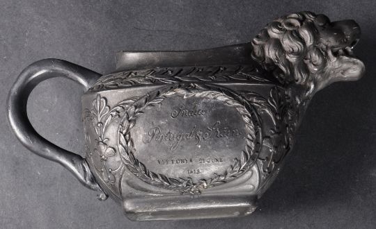 Two pieces of 19th Century Wellington military interest memorabilia comprising a polished bronze plaque of the Duke in side profile portrait form and the other being a black basalt ware lion form creamer jug with notation India Portugal & Spain Victoria 21 June 1813.