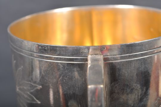 A large 19th Century silver white metal lidded trophy / urn of large size in the Arts & Crafts style. Domed lid with bullet shaped tapered finial and set with engraved geometric panels and rosettes. The twin handles decorated with reeds and floral lozenge and the rest of the piece further decorated. Eagle mark & 25 to rim. Measures approx; 43cm tall.