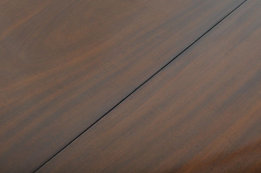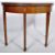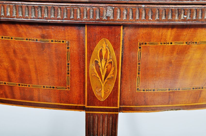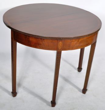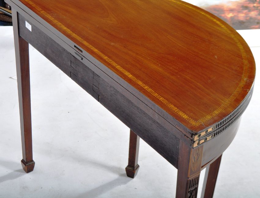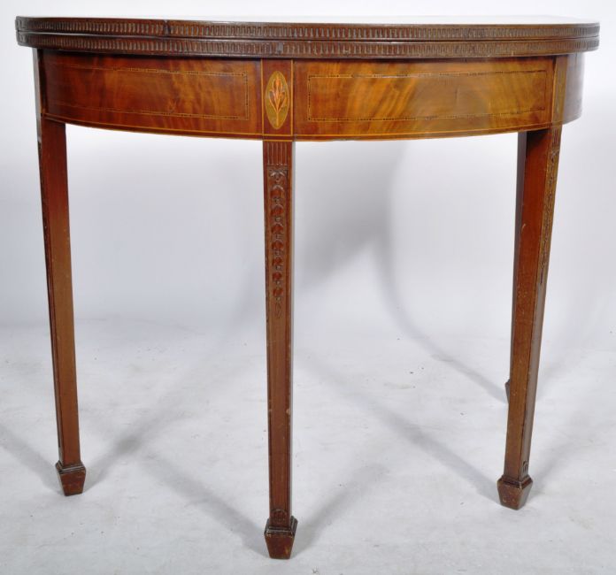 An 18th Century mahogany tea table in the manner of Robert Adam. Folding Demilune top with flame mahogany panels and inlaid stencil work. All raised on tapering square legs over spade feet. Measures approx; 75cm x 90cm diameter.