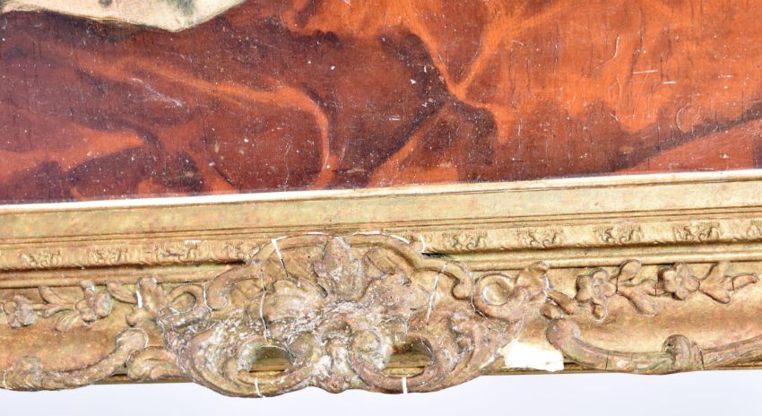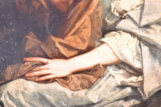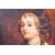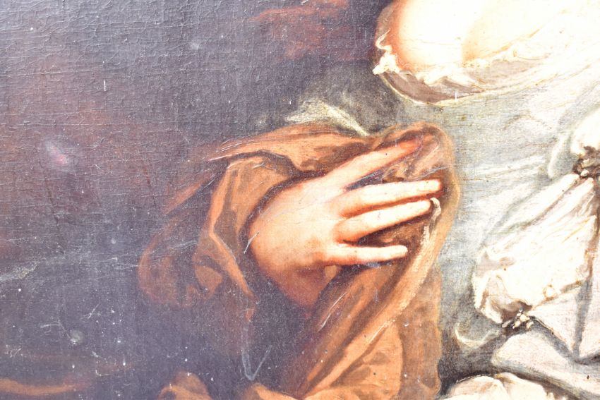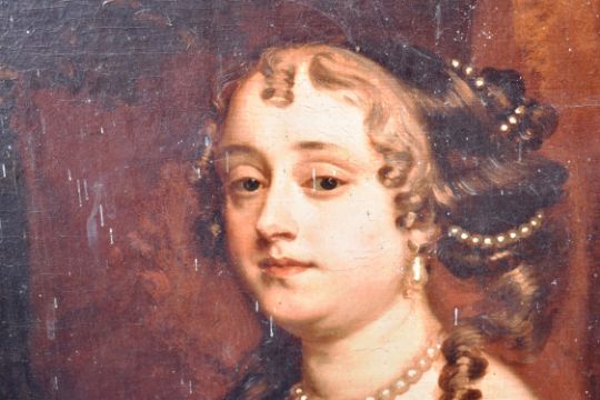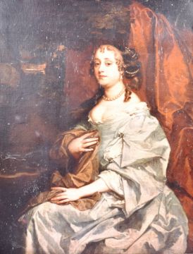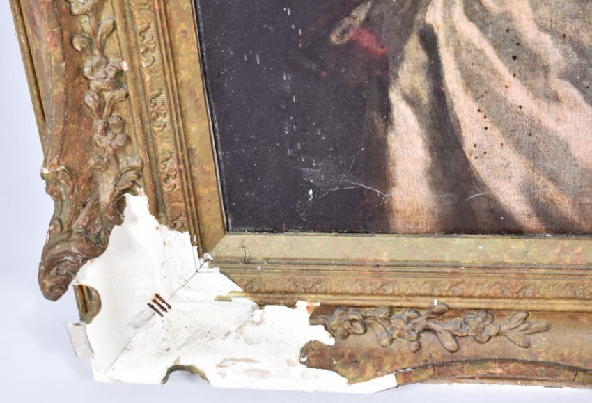 A 20th Century oleograph on canvas portrait painting depicting a lady seated in full garments with a draped red velvet curtain to the backdrop. Set within a decorative gilt scrolled frame with foliate detailing. Wear commensurate with age. Measures approx; 112cm x 80cm.
