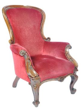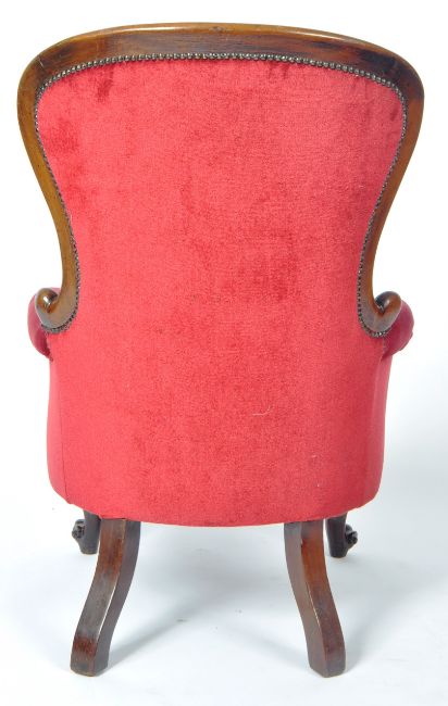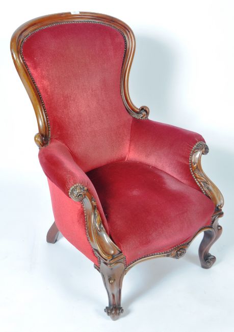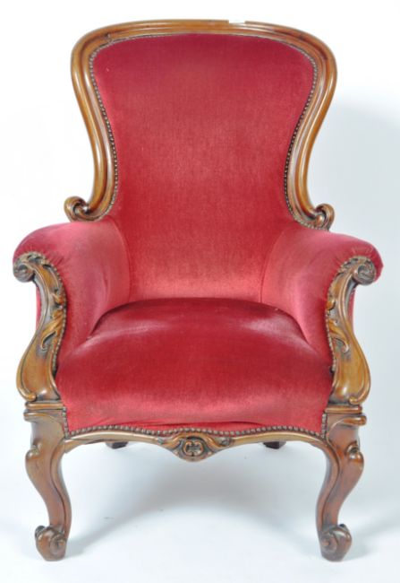 A 19th Century Victorian mahogany framed library reading armchair having a carved show wood frame with acanthus leaf scroll arms and studded borders to the scarlet red upholstery. All raised on carved cabriole scroll legs. Measures approx; 100cm x 70cm x 60cm.