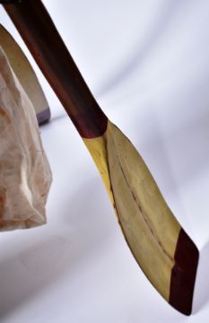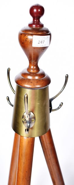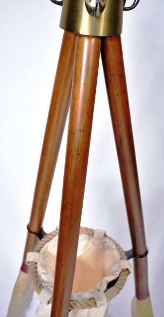 A late 20th Century coat / stick stand constructed from three rowing oars united by a turned finial atop with each oar splaying out surrounding a central canvas stick rest within. Painted oars and brass features throughout. Measures approx; 144cm tall.